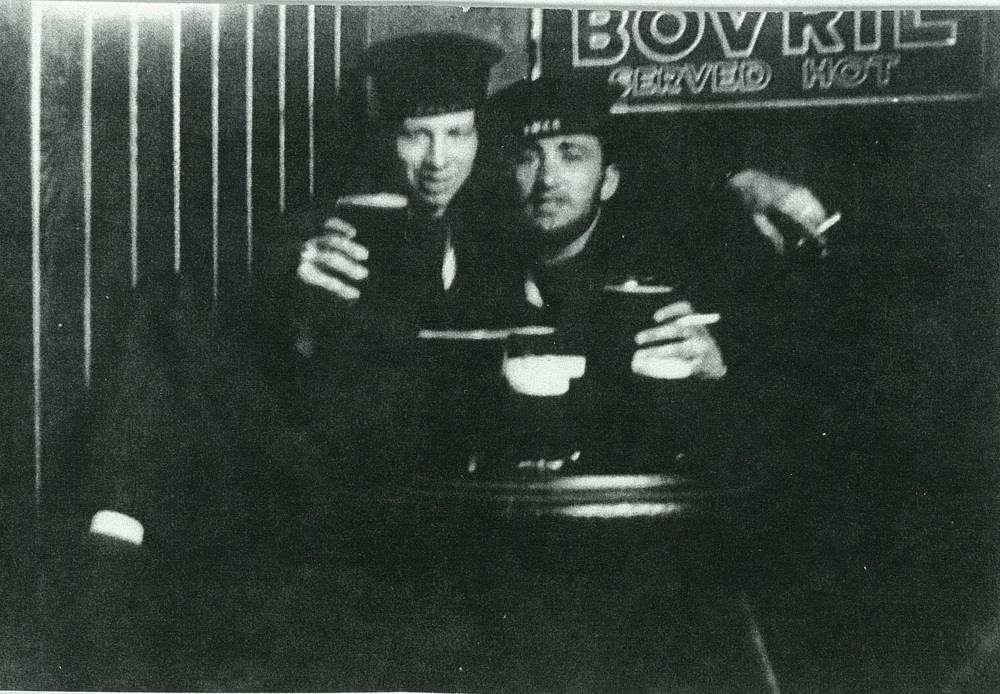 (36) Tot issue while at St. John's, Newfoundland (37) Ivan Reeves at Starboard depth charge thrower (38) Rene, Jim and Clem (39) Paul Wilkins (and Sonja) (40 & 41) Hank on AA gun (42) Lt Frank Ellis, Commanding Officer (43) Bernard Walker, Cox's (44) Raymond Burton (right) and Russell