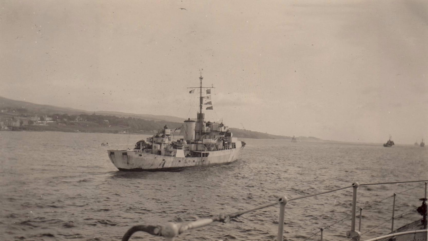 (1) HMCS MERRITTONIA (foreground) and HMCS Perry Sound K341 alongside jetty (2) HMCS Parry Sound K341 underway (3) HMCS Parry Sound K341 following astern of HMCS MERRITTONIA ( 4) Derry Harbour (5) Lead ships of EG ahead of HMCS MERRITTONIA (6) HMCS Parry Sound K341 takes position following astern of HMCS MERRITTONIA (7) HMCS Parry Sound K341 in formation following astern of HMCS MERRITTONIA