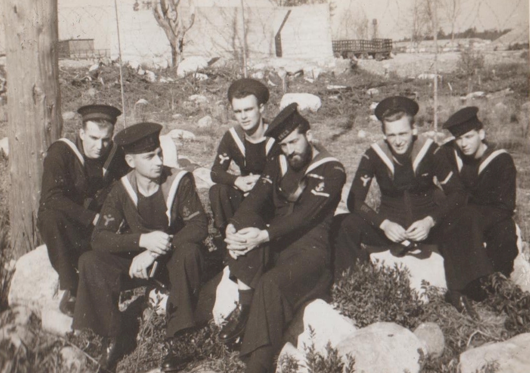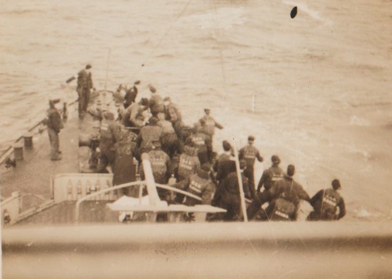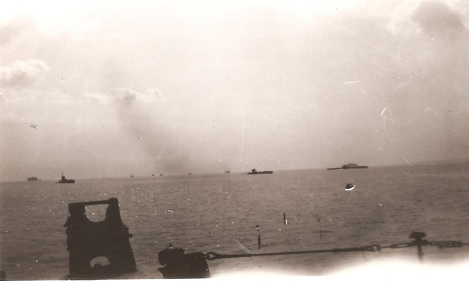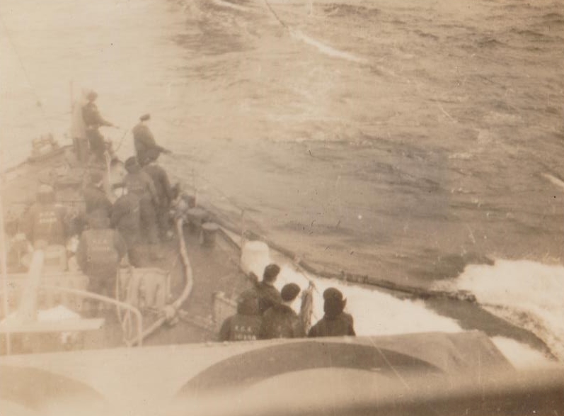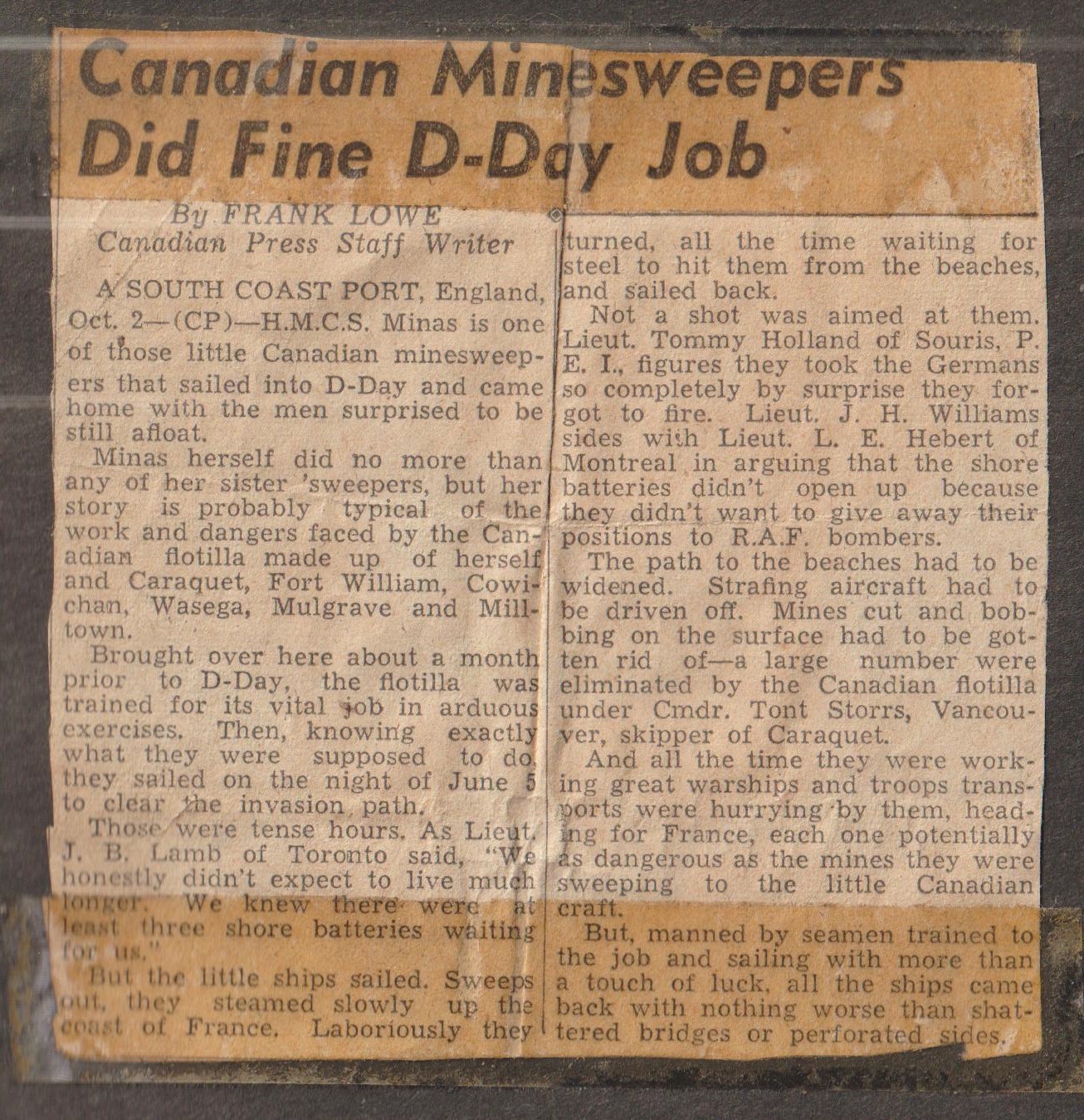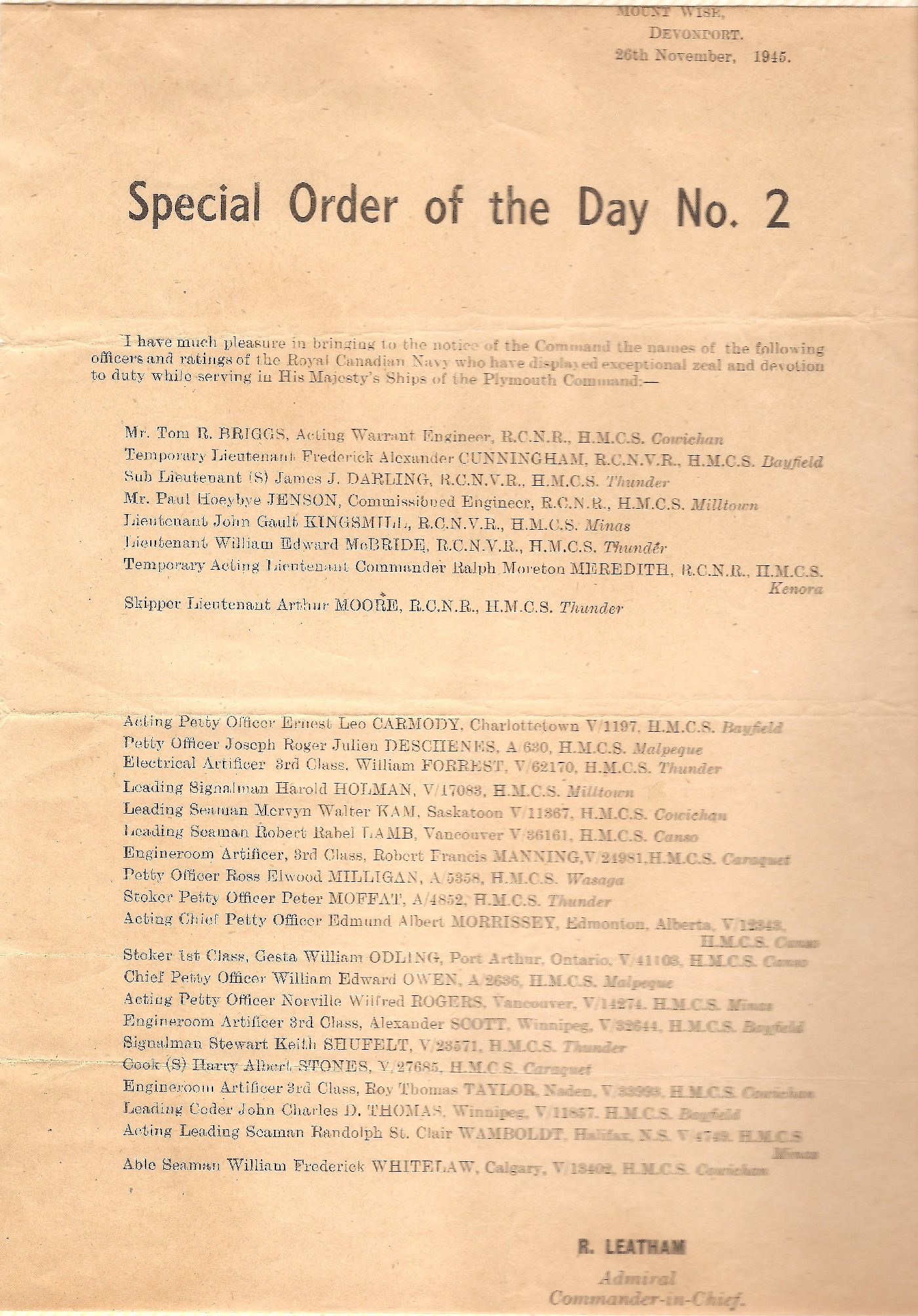 (HH01) British subs in the Solent - May 1944. Spithead Forts in the background. Photo taken from HMCS MILLTOWN (HH02) Special Order of the Day No. 2 - officers and ratings of the 31st Minesweeping Flotilla - Mentioned in Despatches (HH03) Edmund Green and James Lovie on HMCS MILLTOWN (HH04) Edmund Green, Paul Jensen and James Lovie on HMCS MILLTOWN (HH05) Gordon Albright, Thomas Cox and Roland Chalifoux on HMCS MILLTOWN as Portsmouth, England