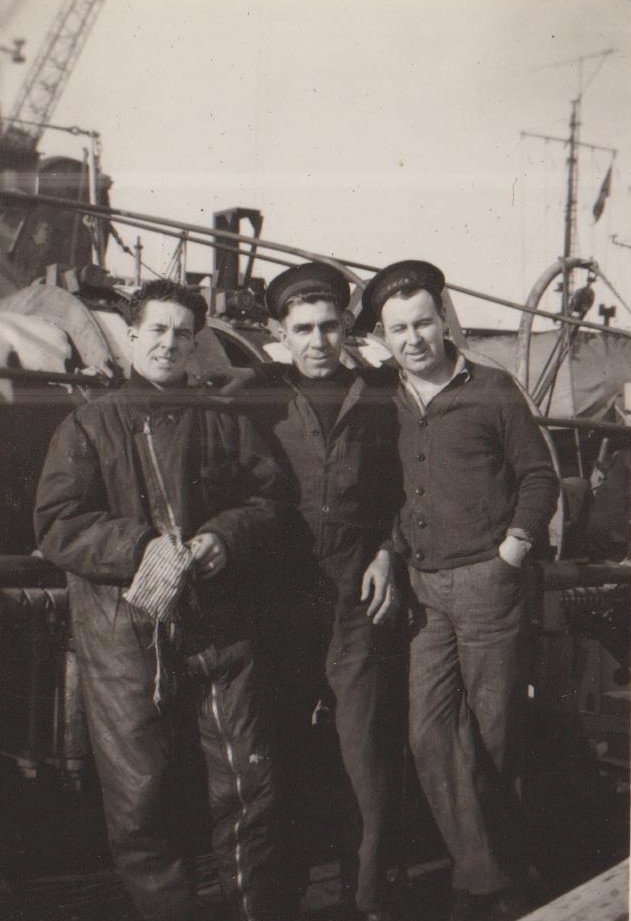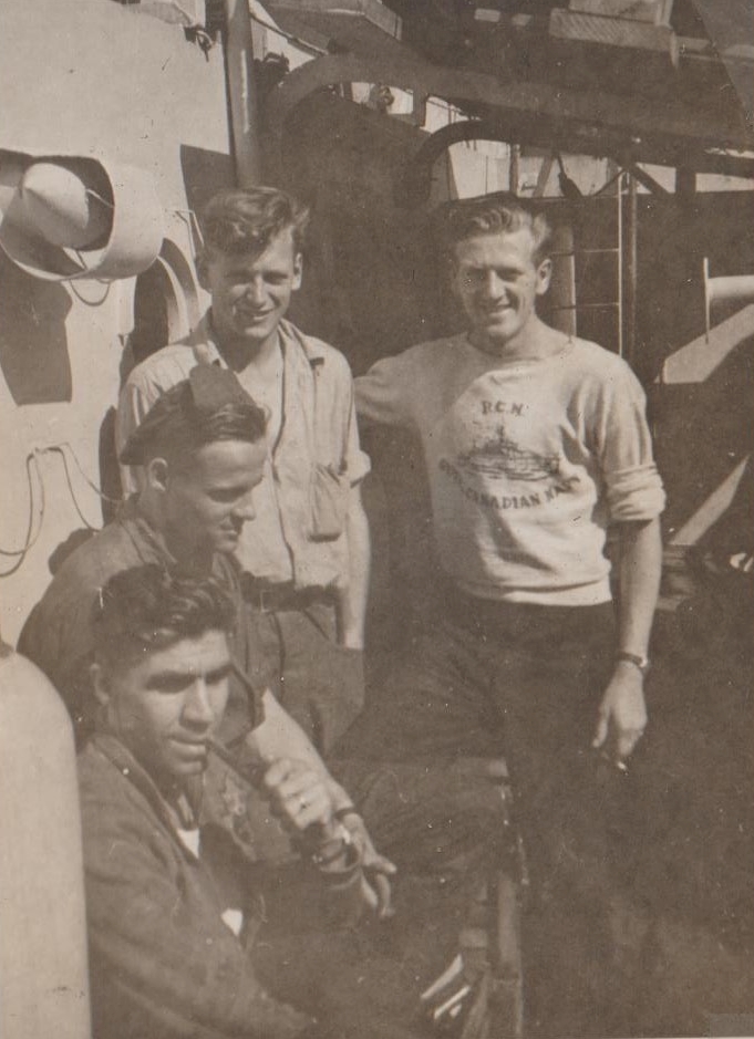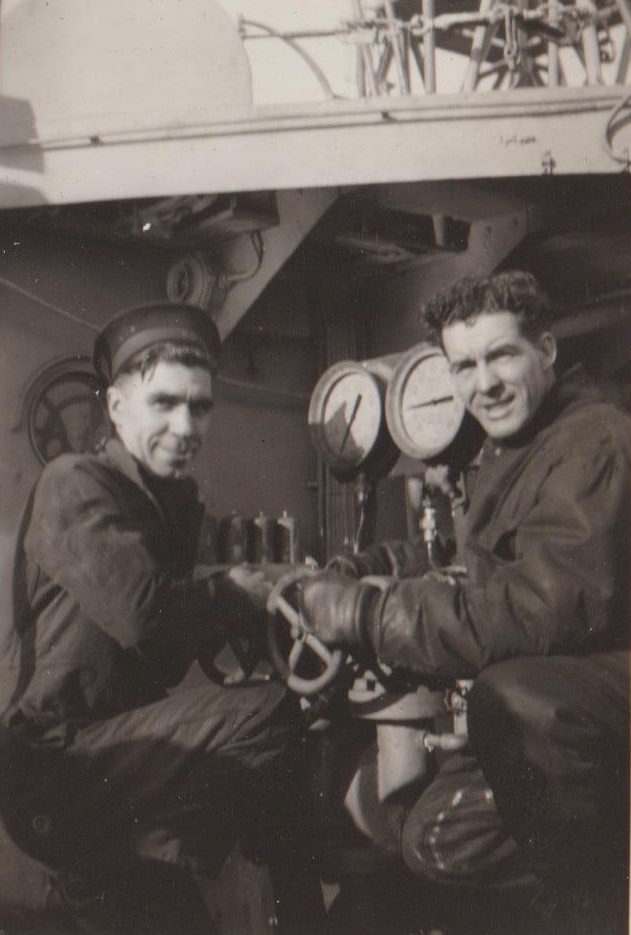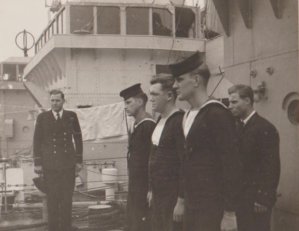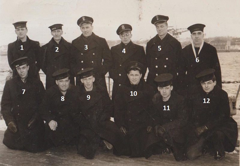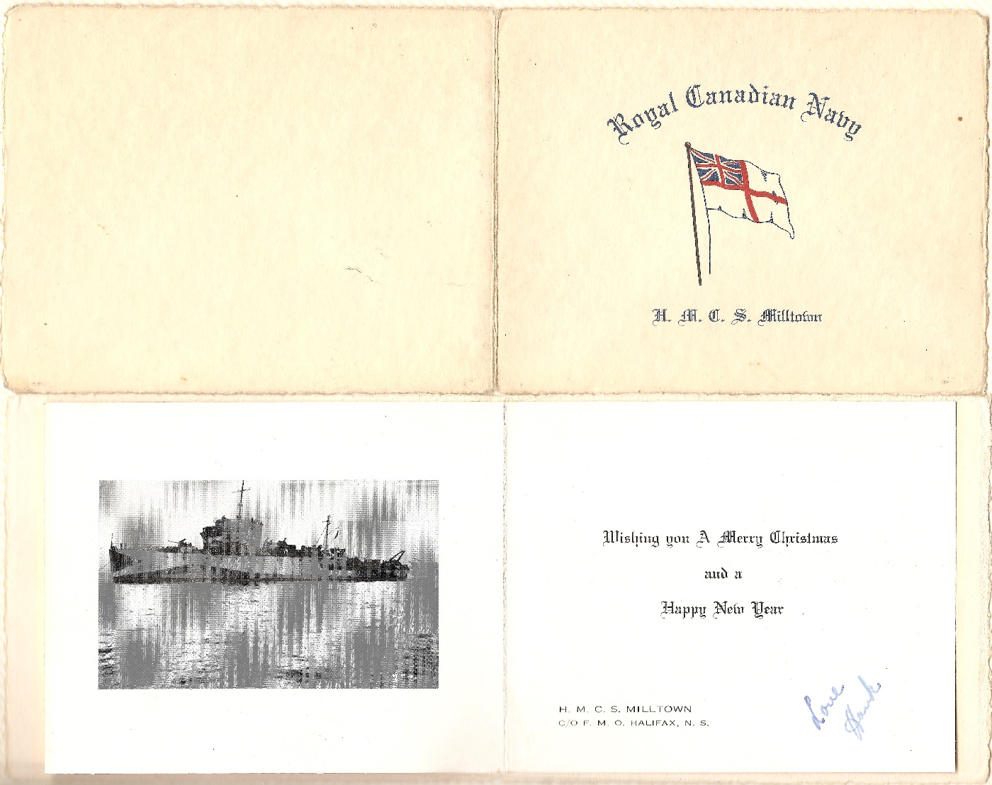 (HH06) Gordon Albright, Thomas Cox and Roland Chalifoux on HMCS MILLTOWN as Portsmouth, England (HH07) Gordon M. Albright on HMCS MILLTOWN (HH08) Harold Holman (standing) and Lawlor on the jetty by HMCS MILLTOWN (HH09) Harold Holman on HMCS MILLTOWN (HH10) HMCS MILLTOWN Christmas card
