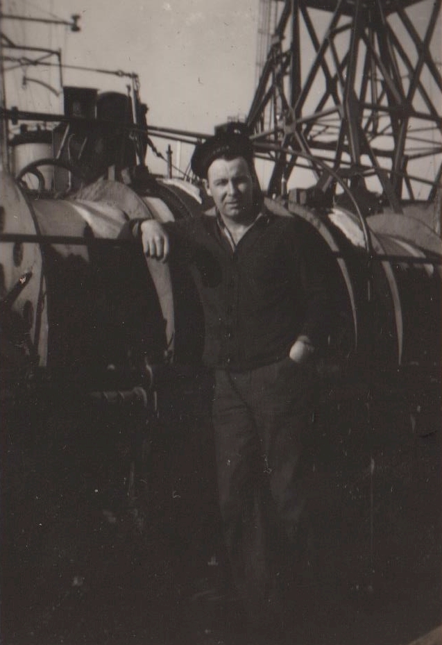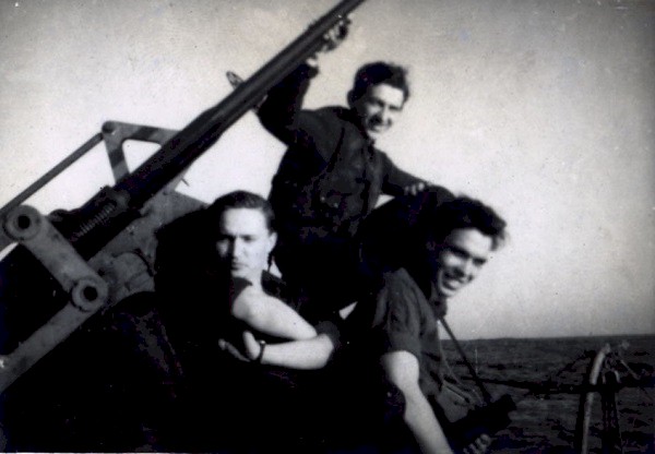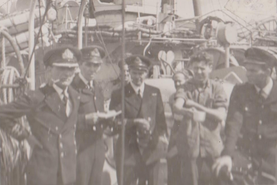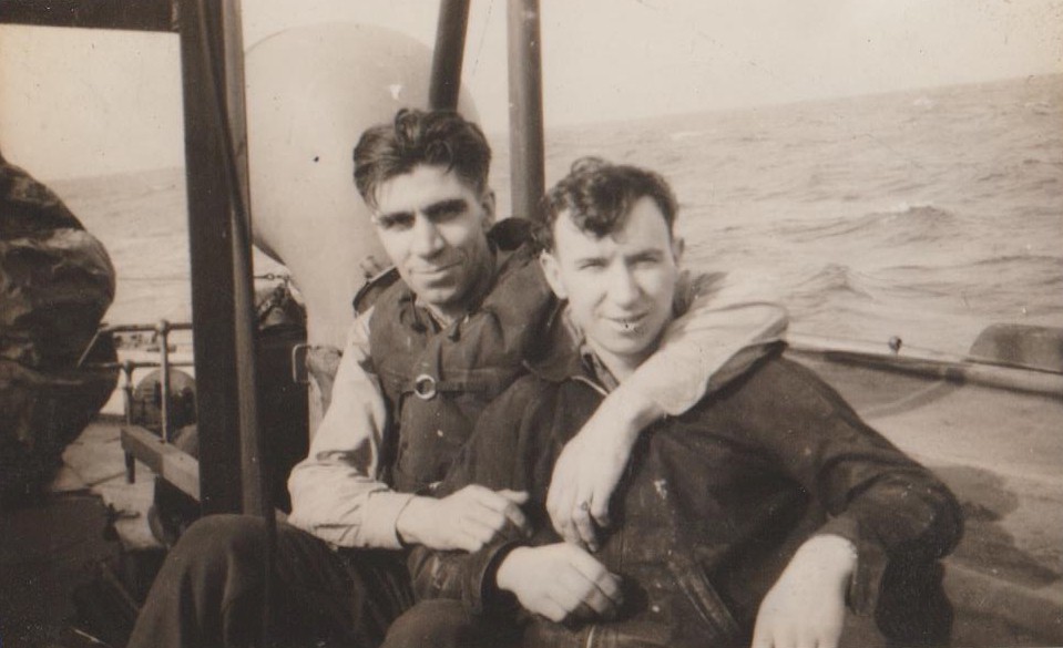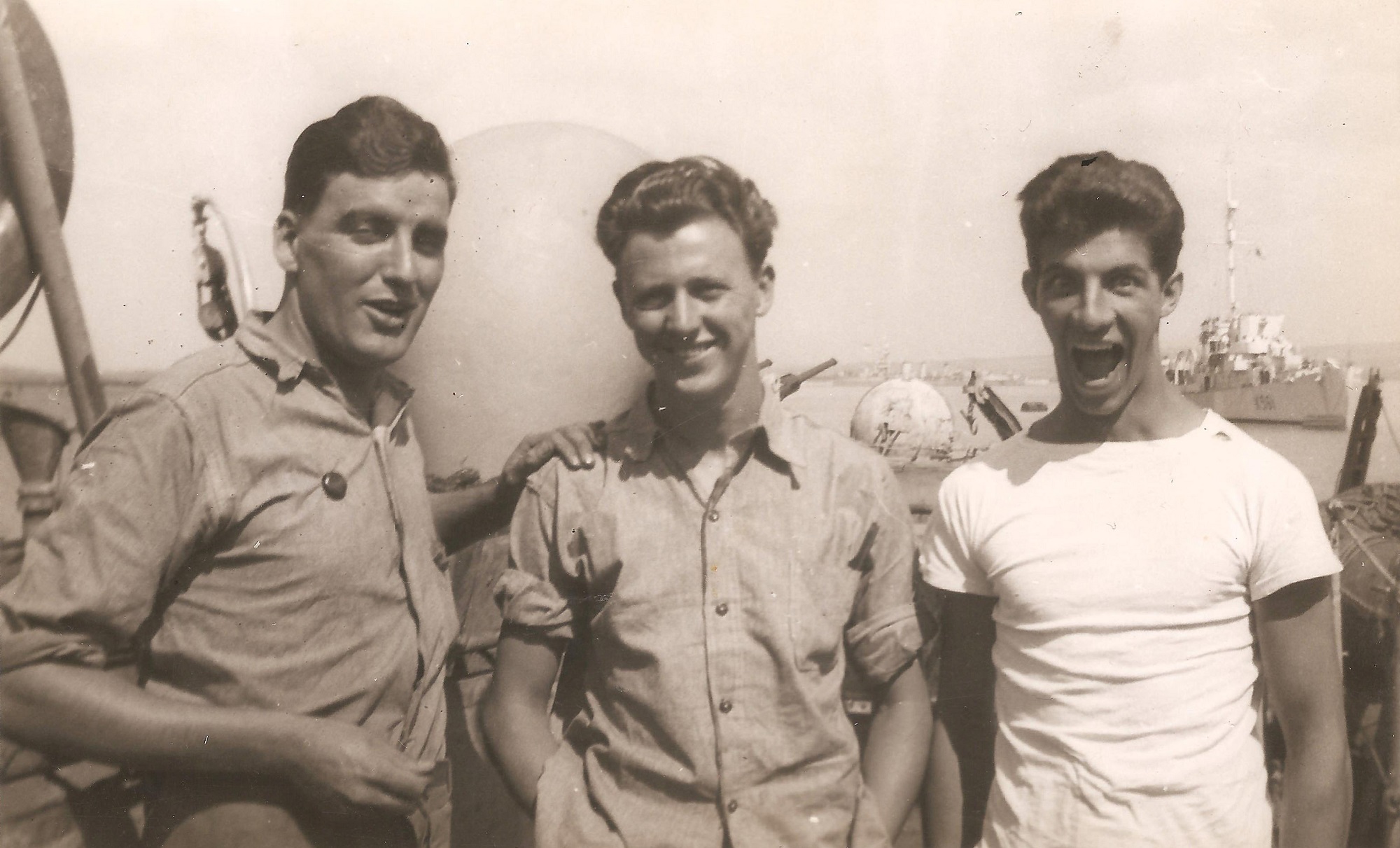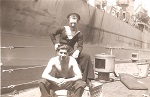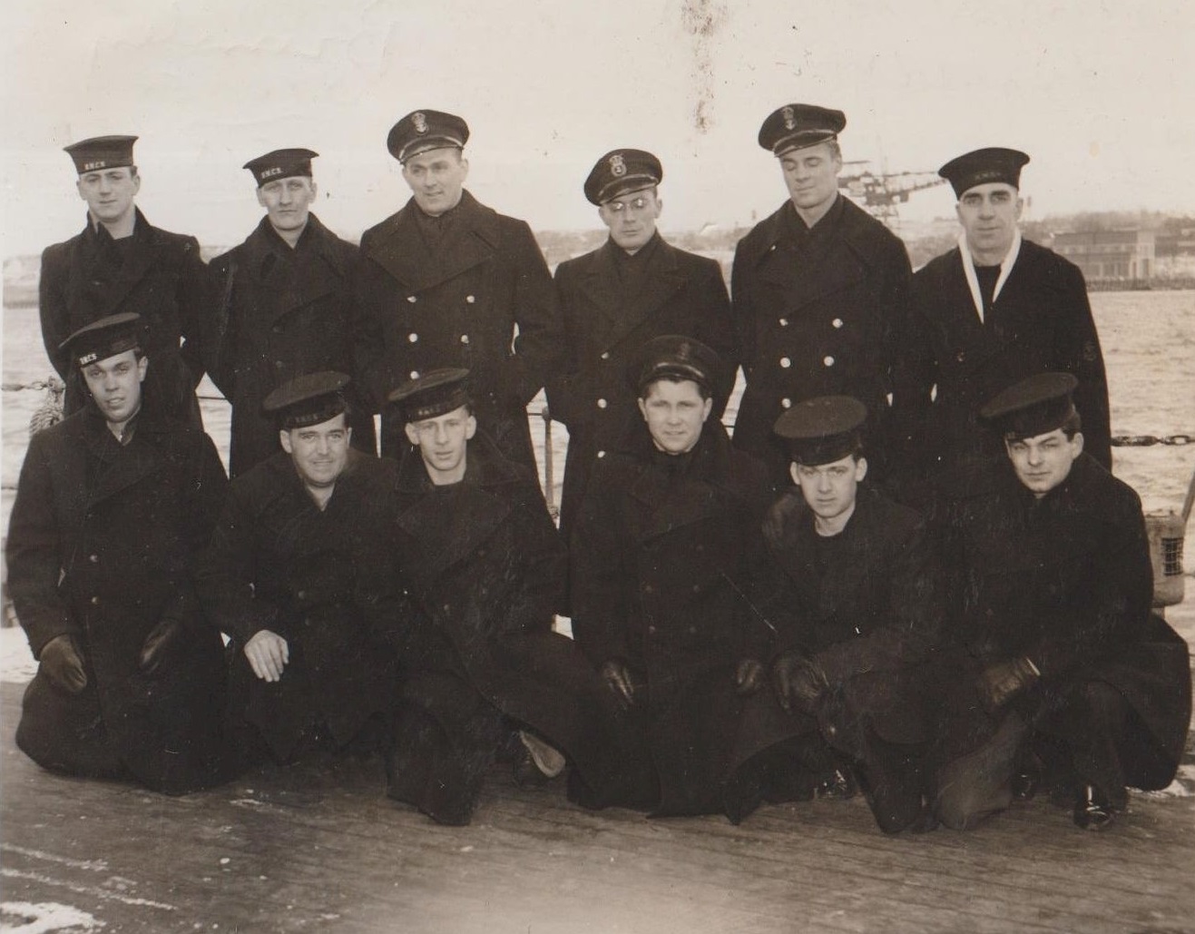 (HH06) Gordon Albright, Thomas Cox and Roland Chalifoux on HMCS MILLTOWN as Portsmouth, England (HH07) Gordon M. Albright on HMCS MILLTOWN (HH08) Harold Holman (standing) and Lawlor on the jetty by HMCS MILLTOWN (HH09) Harold Holman on HMCS MILLTOWN (HH10) HMCS MILLTOWN Christmas card