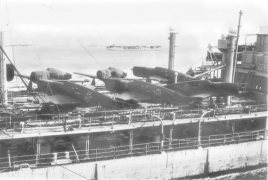 The aircraft on the merchantman are early versions of the P-51 Mustang fighter (identified by Dennis Cardy by the air scoop under the fuselage)