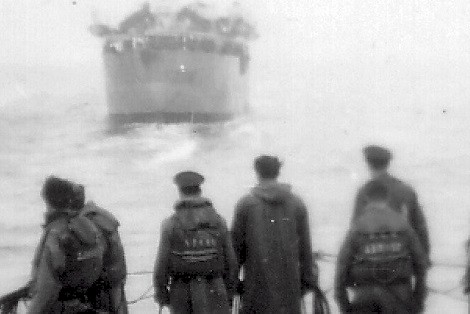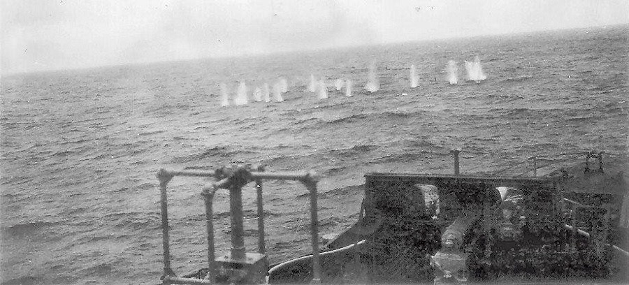 Splashes of the Hedgehog mortars off the port bow of HMCS MONNOW K441