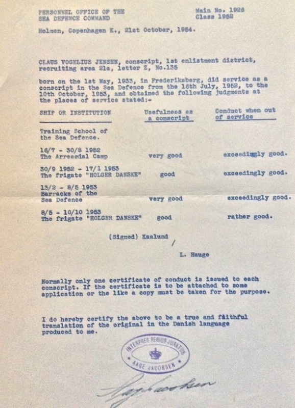 Jensen, Claus Vogelius, ASDIC Operator, Royal Danish Navy, 30 Sep 1952 - 17 Jan 1953 and 08 May 1953 - 10 Oct 1953 (HDMS Holger Danske)