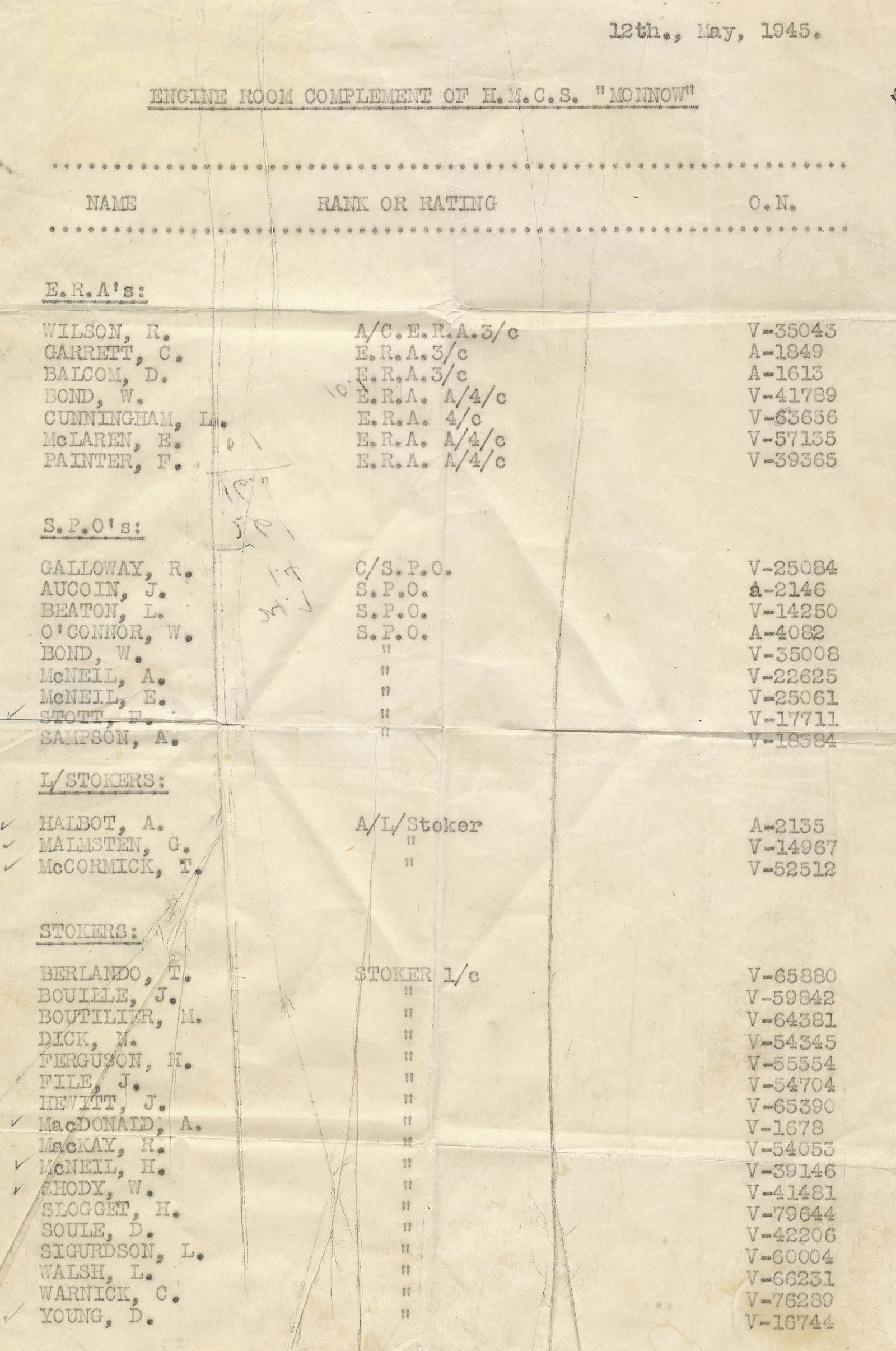 (ER12) - Engine Room crew list for HMCS MONNOW - 12 May 1945
