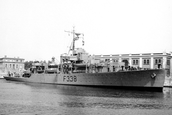 Laid down as HMCS MONNOW, named after an English river, she was transferred newly built to the RCN at Bristol on 08 Mar 1944. Following workups at Tobermory in Apr 1944 MONNOW joined EG C-2 in May and served with that group until Aug 1944, when she was re-assigned to EG 9, Londonderry. She served throughout her career in U.K. waters except for a round trip to Gibraltar in Oct 1944, and to Kola Inlet with convoys JW.62 and RA.62 in Nov and Dec 1944. On 13 May 1945, she left Greenock to pick up JW.67 for North Russia but was detached the next day to escort surrendered U-boats en route from Trondheim to Loch Eriboll. She left Londonderry on 25 May 1945 for Sheerness, where on 11 Jun 1945 she was paid off and returned to the RN. In Oct 1945 she was sold to the Danish Navy and re-named Holger Danske. Holger Danske is a Danish symbol of the resistance, will, and fighting spirit when Denmark is in danger. She was used as a cadet training ship. As some of the cadets during the (German) occupation were connected to the resistance group "Holger Danske", there were additional reasons to include the freedom fighters' symbol on this ship's badge. She was broken up at Odense, Denmark in 1959. MONNOW was one of two among the larger RCN warships that never saw a Canadian port.