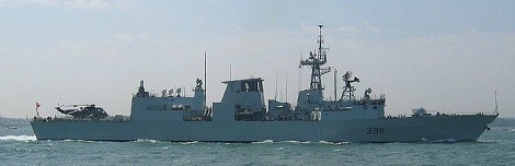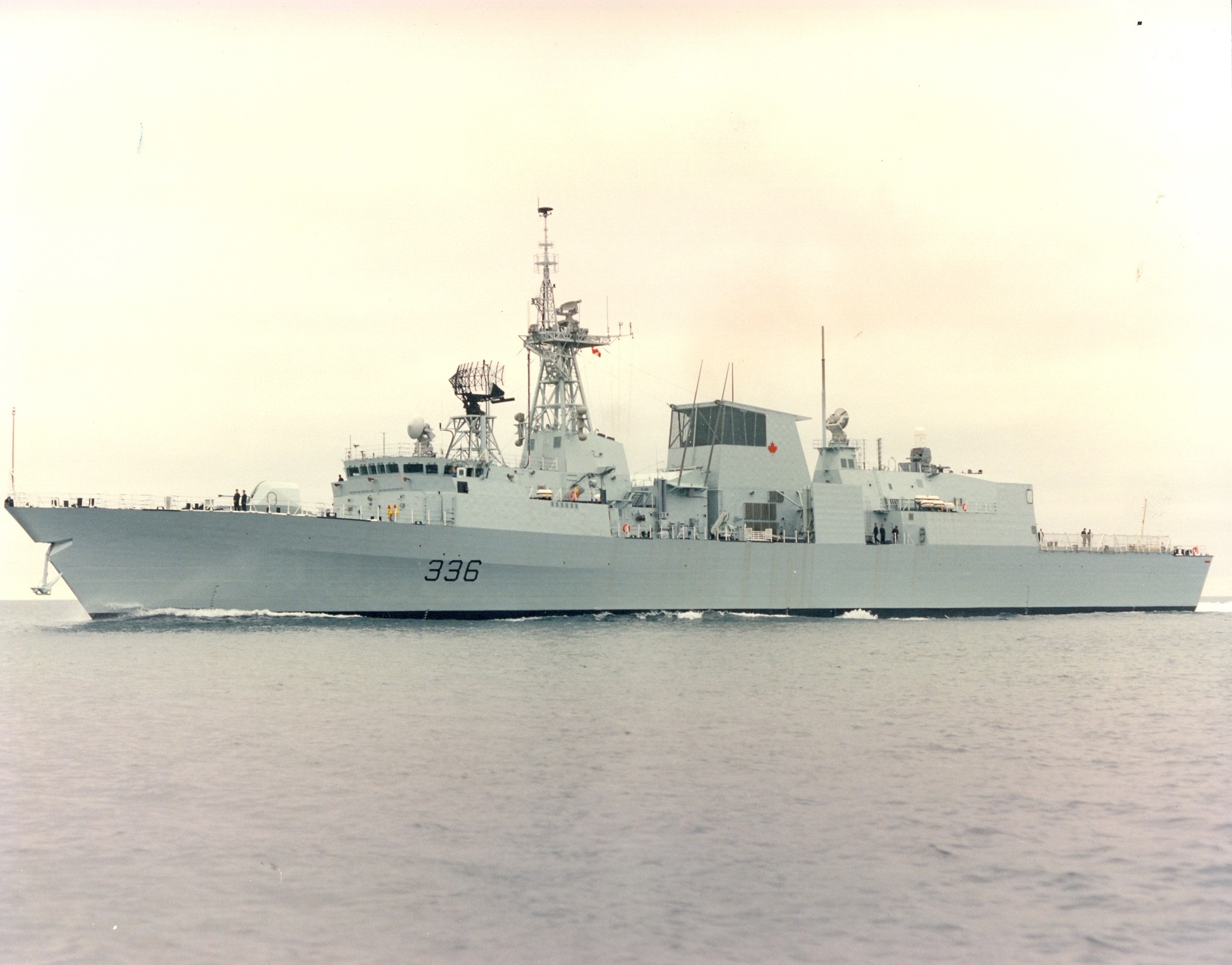 She was floated up on 26 Feb1992 and provisionally accepted on 27 Jul 1993. After a series of trials, she was commissioned at MONTRÉAL on 21 Jul 1994, and designated a French Language Unit. On 04 Jan 1995, MONTRÉAL sailed from Halifax to join NATO's SNFL in the Adriatic Sea, blockading the former Yugoslavia. While so employed she conducted 187 hailings, 57 boardings and diverted 4 vessel. During this tour she twice acted as flagship and returned home on 19 Jul 1995. During 1997, 12,500 anechoic tiles were applied to MONTRÉAL's hull in order to reduce noise. This experiment was not entirely successful, and no other CPFs were so fitted. On 10 Aug 1998, MONTRÉAL departed Halifax to join the NATO fleet off Florida, and with its Immediate Reaction Force paid an epoch-making visit to St. Petersburg, to celebrate the 300th Anniversary of the Russian navy. She was back in Halifax on 15 Dec 1998. During the summer of 2000 MONTRÉAL represented Canada in the Millennium International Fleet Review in New York City, then escorted the Tall Ships to Halifax, where she acted as flagship for the Commander-in-Chief, Governor-General Adrienne Clarkson, to review the Tall Ships sail past. The following week she was deployed to support ATHABASKAN in Operation Megaphone, the boarding and escorting of GTS Katie to Bécancour, Quebec.