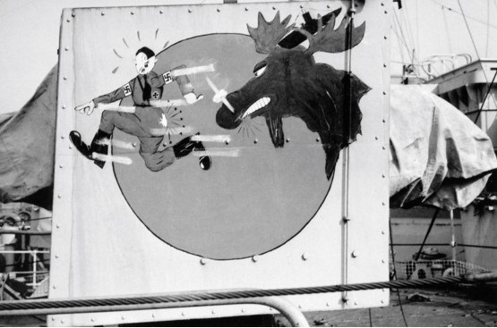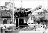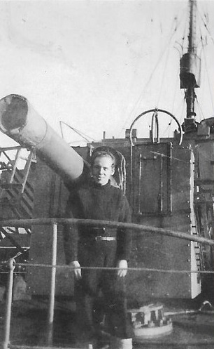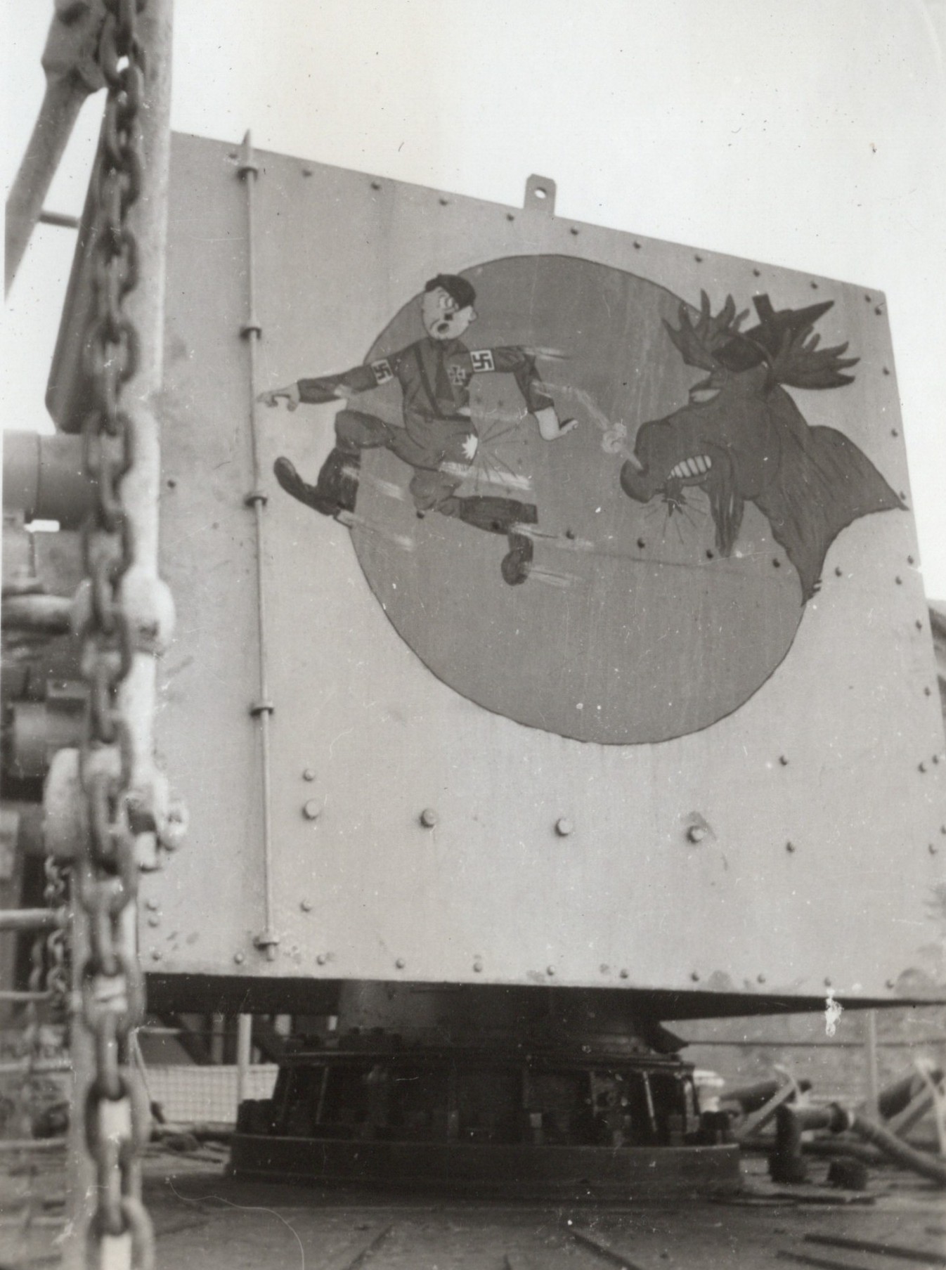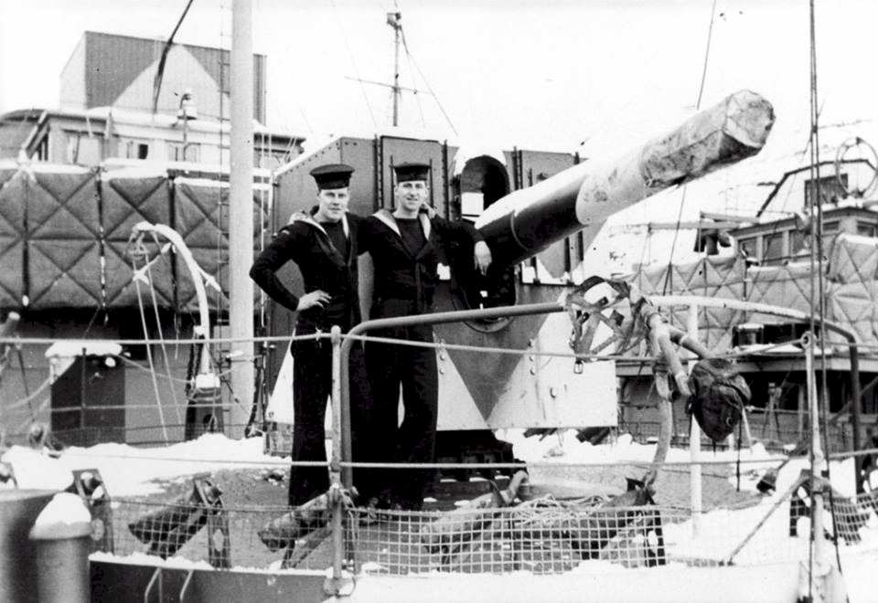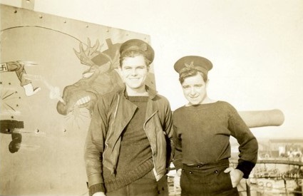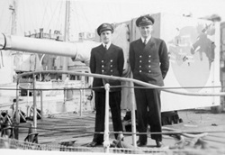 S/Lt’s Ian Morrow, left and Bill Spinney, right by gunshield on HMCS MOOSE