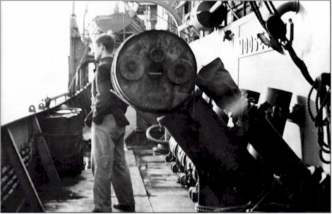 charge launchers on HMCS MOOSE JAW K164. Sailor is unknown.