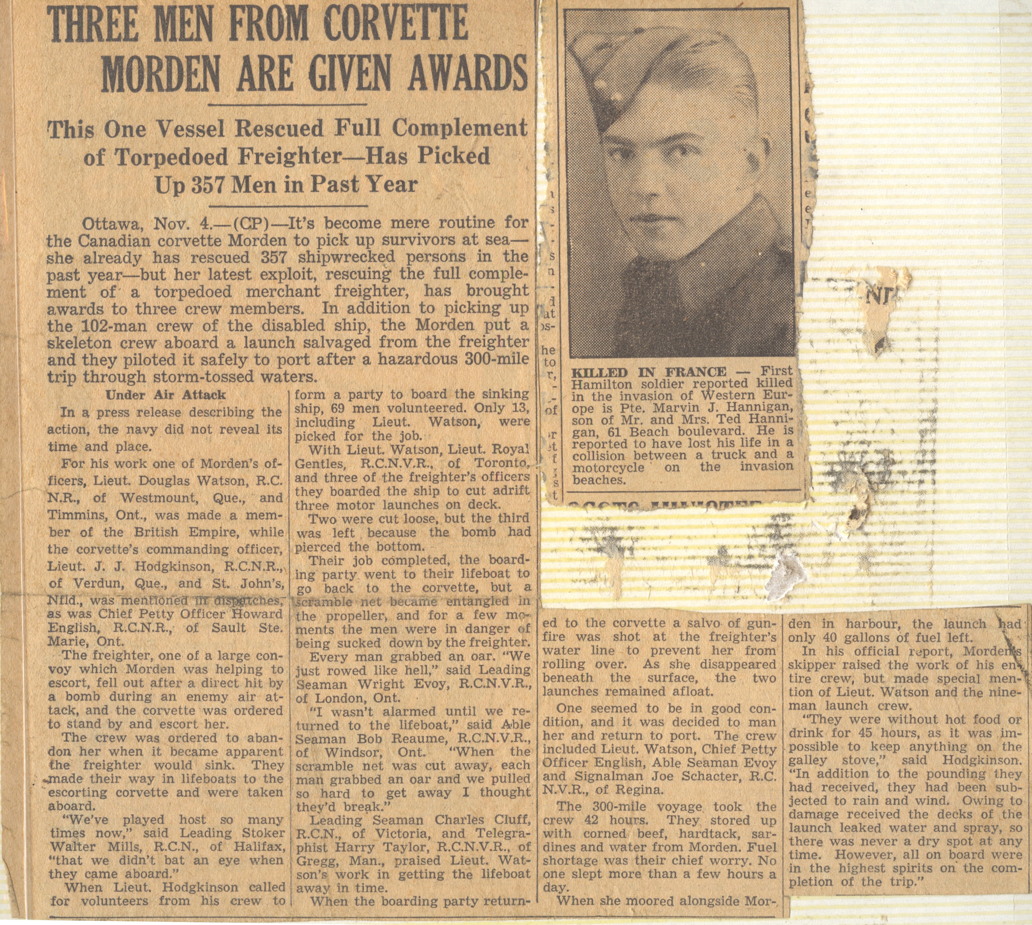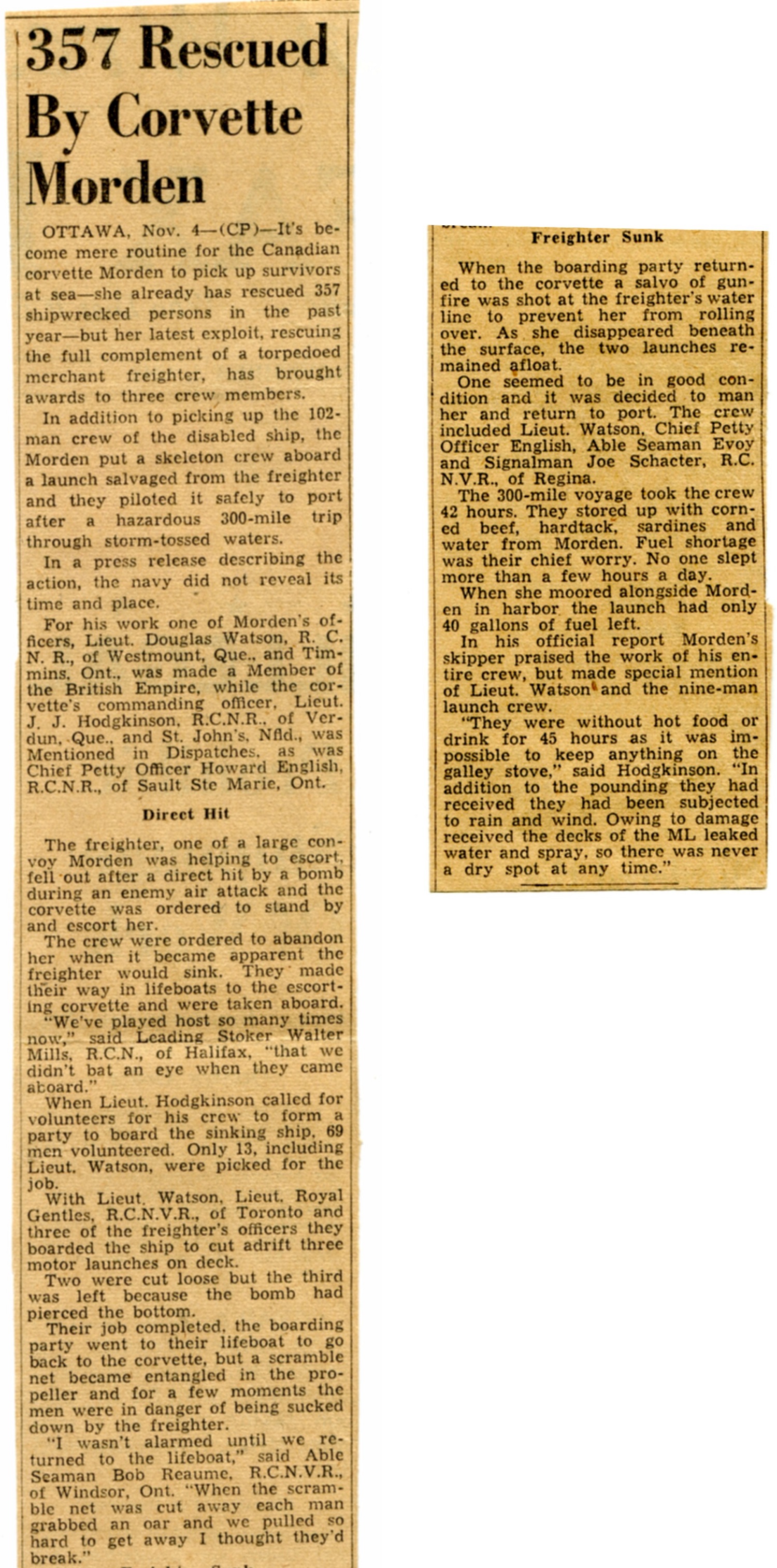 (RAS223) The motor launch, which floated free from the SS CITY OF CHRISTCHURCH, was salvaged and taken to the UK by a skeleton crew from HMCS MORDEN K170 (RAS224) Article on 3 of MORDEN'S crew receiving awards for the rescue of the crew of the SS CITY OF CHRISTCHURCH and of the salvage of one of the ship's launches. Listed in the article: Lt Douglas Waston, RCNVR awarded OBE; Lt J.J. Hodgkinson, RCNR, CO, awarded M.I.D.; and CPO Howard English, RCNR, awarded M.I.D. // Salvage Crew: Lt Watson, CPO English; Able Seaman Evoy; Signalman Joe Schacter, RCNVR // Others mentioned in the Article Leading Stoker Walter Mills, RCN; Lt Royal Gentles, RCNVR; Leading Seaman Wright Envoy, RCNVR; Able Seaman Bob Reaume, RCNVR; Leading Seaman Charles Cluff, RCN; Telegraphist Harry Taylor, RCNVR