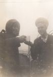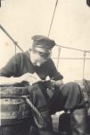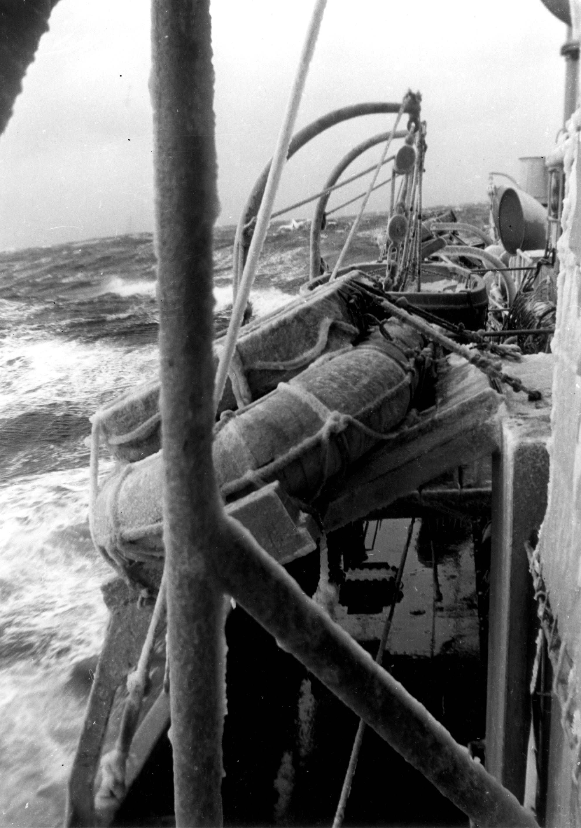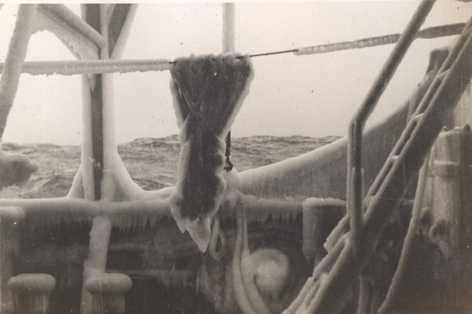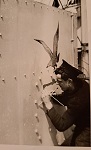 (RAS259) Ice building up on HMCS MORDEN K170 (RAS260) An unknown sailor on the uppers being given a drink ... possibly a cuppa Kye* (RAS261) The White Ensign on HMCS MORDEN K170 worn threadbare from North Atlantic winds and spray (RAS262) Fergie, looking a little bit like Moe from the Three Stooges with his new haircut (RAS263) An unknown sailor by an air intake on HMCS MORDEN K170 * Kye was a hot drink made from chocolate, sugar, and milk. Ingredients: A block of coarse chocolate, scoops of sugar, and canned milk. Preparation: Break the chocolate into pieces, place in a saucepan with hot water, melt the chocolate, add the condensed milk, bring to a boil, and serve in mugs