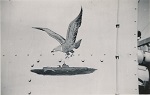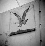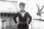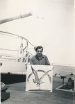 (RAS189) Gunshield art on HMCS MORDEN K170 (RAS190-RAS191) Two photos of sailors in the ship's boats painting the side of HMCS MORDEN K170. In the first photo, an oar from the ship's whaler is visible on the right hand side. (RAS192) An unknown sailor standing in from of the gunshield art on HMCS MORDEN K170 (RAS193) Sub-Lieutenant Walker on the bridge of HMCS MORDEN K170