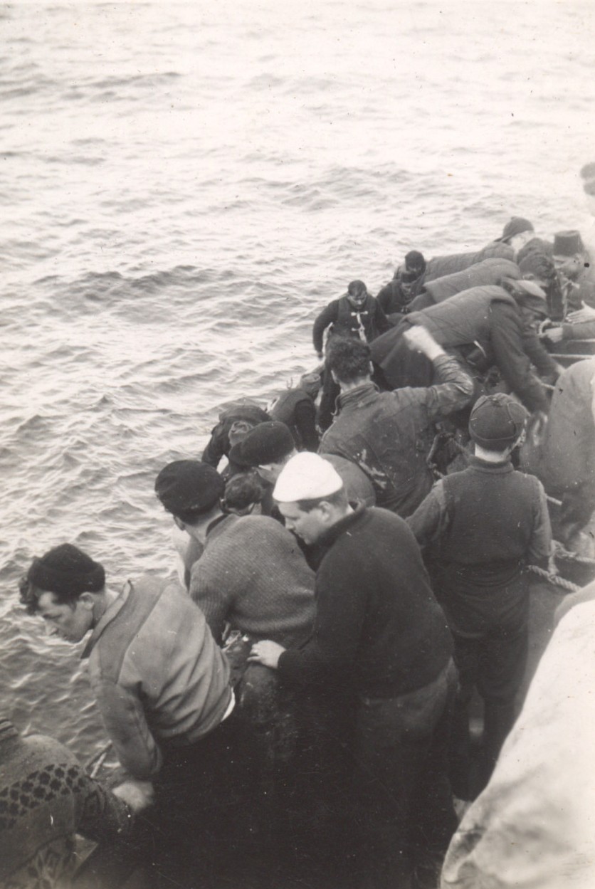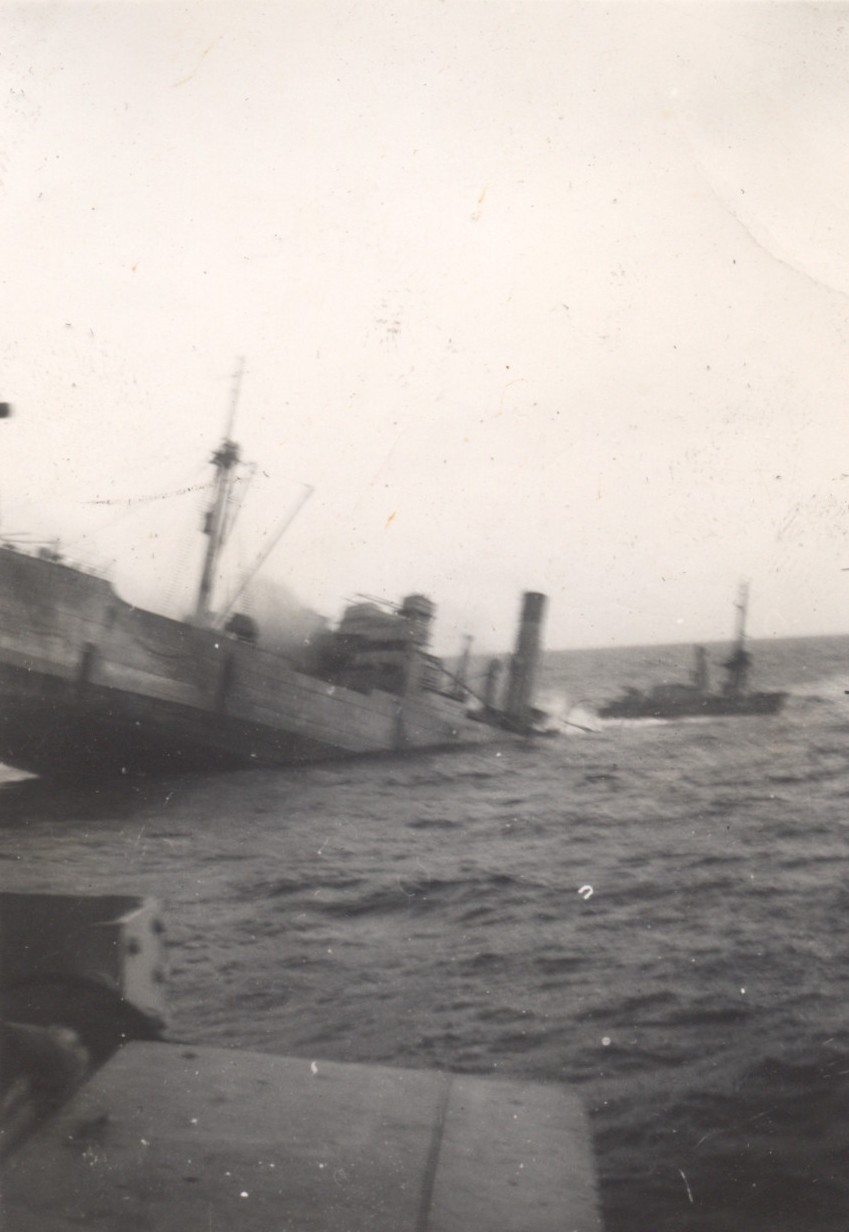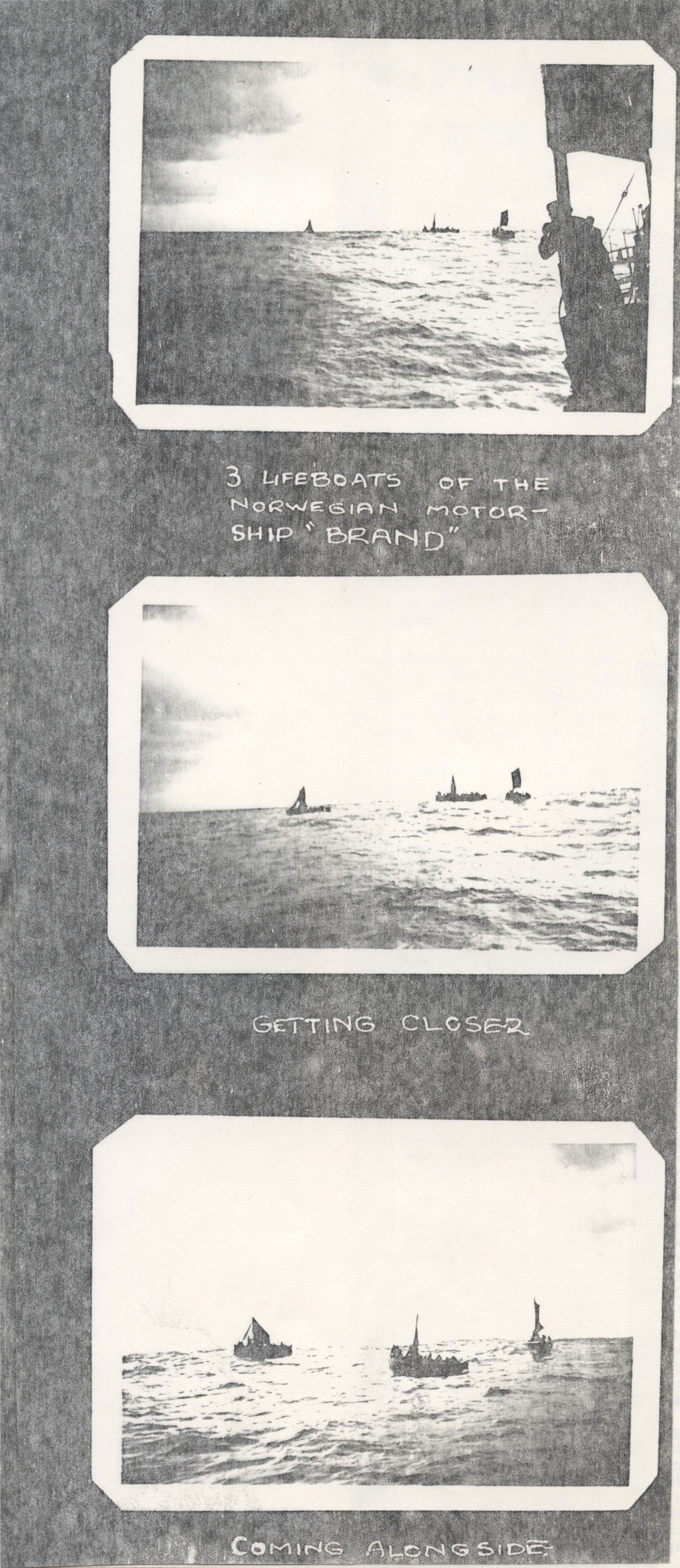 (RAS256-RAS265..) HMCS MORDEN K170 rescuing survivors of the Norwegian ship M/S BRAND (RAS266-RAS268) Landing craft, presumably from the M/S BRAND. On photo shows the landing gate down. It is not known of this is a different landing craft or if its the same one and its being scuttled. Note: On 12 May 1943 the Brand (Master Reidar Helgesen) was separated from convoy HX-237 in thick fog and was torpedoed on the port side aft by U-603 and sank after 7 minutes. Two crew members and one gunner were lost. The master, 34 crew members and six gunners abandoned ship in three lifeboats and set sails for Ireland, but were picked up the same day by HMCS MORDEN (K 170) (T/Lt J.J. Hodgkinson, RCNR). A Swordfish aircraft had been sighted in the afternoon and it had probably guided the corvette to the boats. (Source: The U-boat.net)