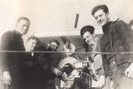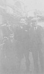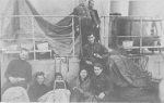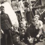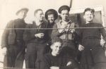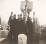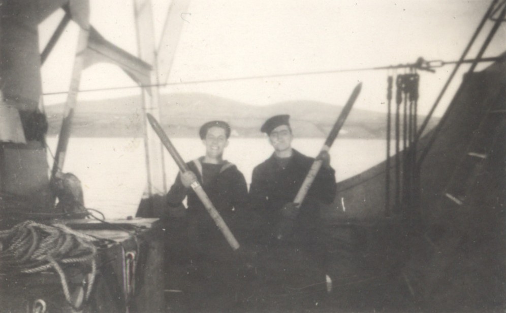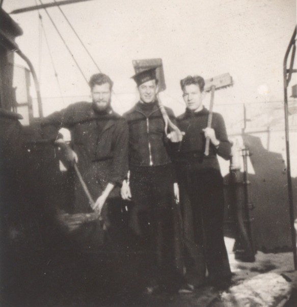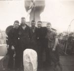 (RAS247) Sailors on HMCS MORDEN K170 with brooms and a shovel. It looks like they are clearing snow off the deck. Ross (Sandy) Somerville on the left. (RAS248) Sailors on HMCS MORDEN by the 4-inch gun. Ross (Sandy) Somerville, standing, 1st on right (RAS249) The same group of sailors on HMCS MORDEN in front of the 4-inch gun. Ross (Sandy) Somerville sitting on the barrel, 1st on right (RAS250-RS251) Sailors on HMCS MORDEN K170 posing for the photo .... then giving the Nazi salute in the 2nd photo. Ross (Sandy) Somerville 2nd from left in both photos.