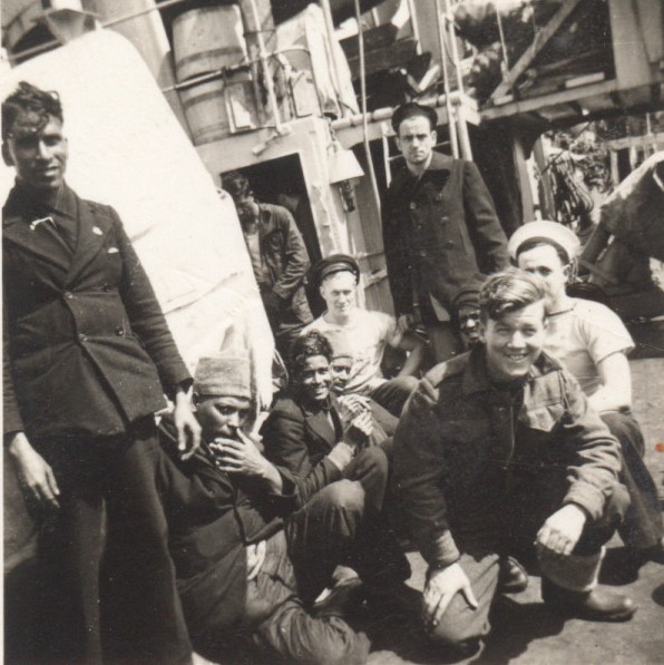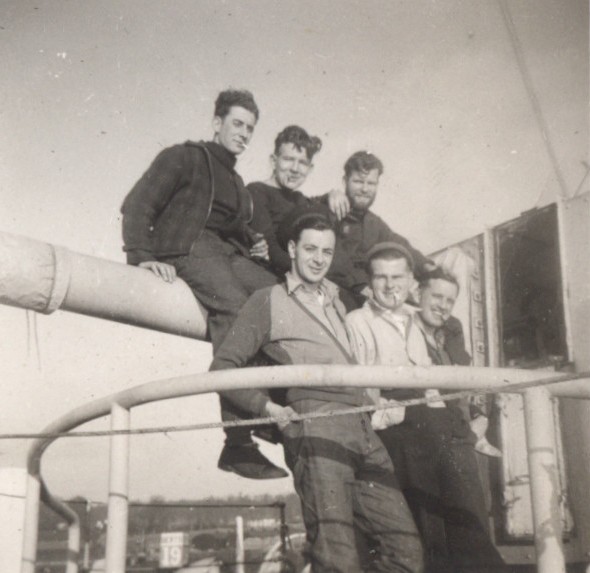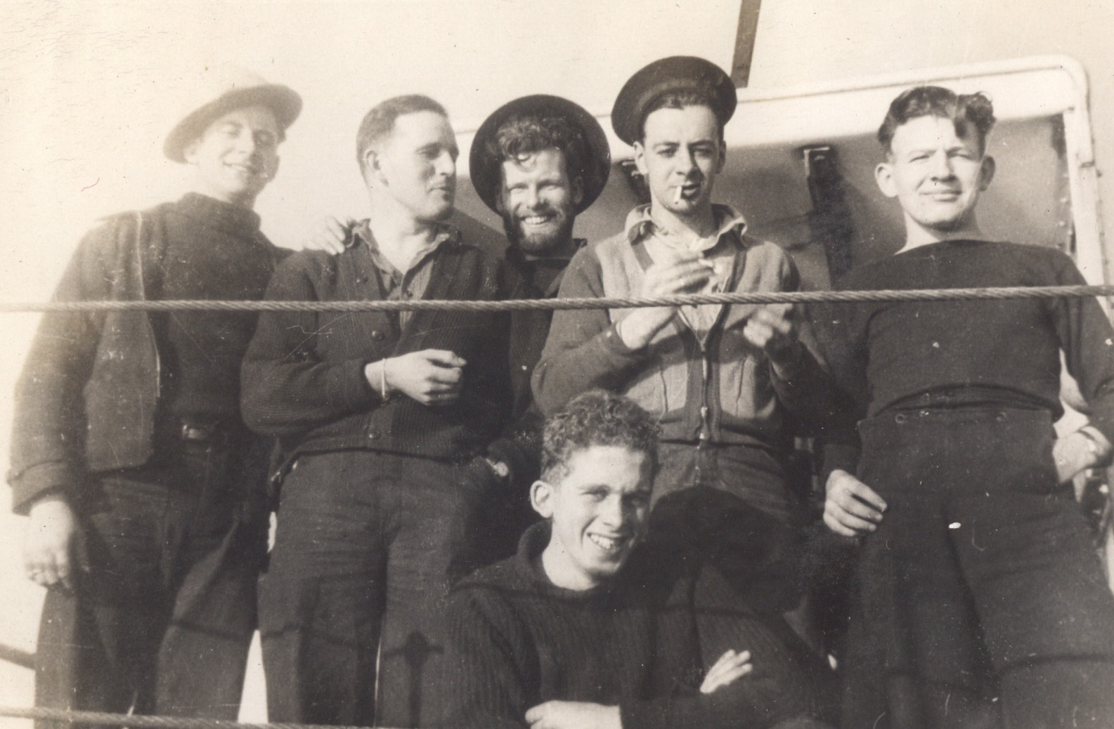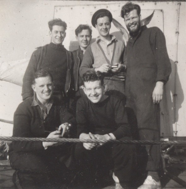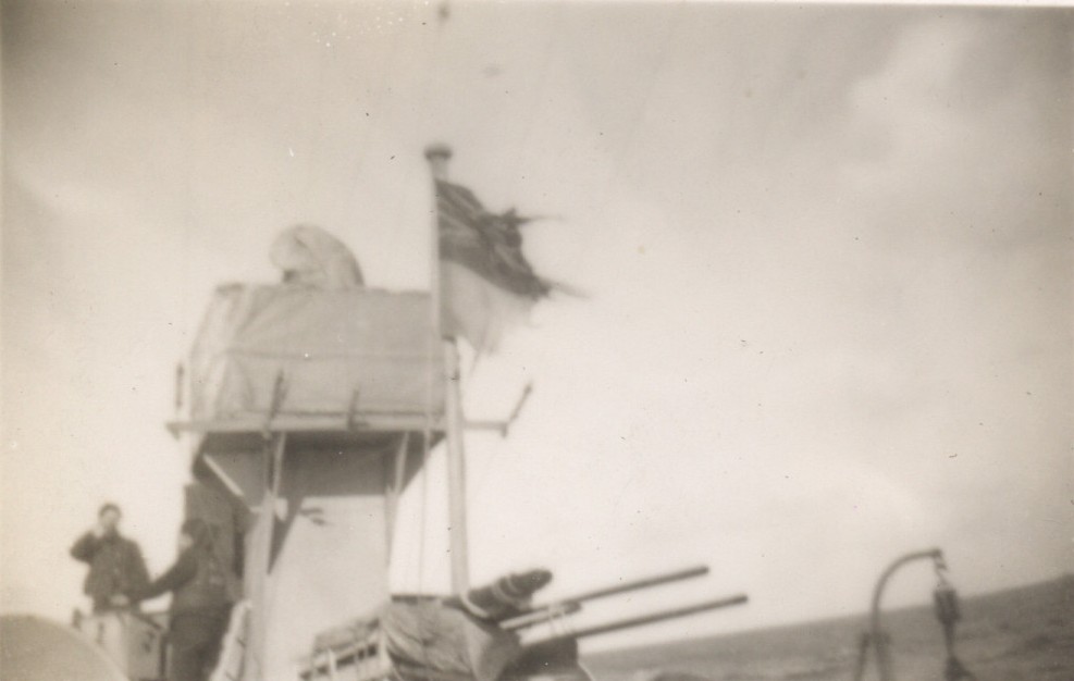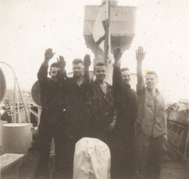 (RAS252) Looking somewhat dejected, an unknown sailor giving a Nazi salute on HMCS MORDEN K170 (RAS253) The White Ensign flying on HMCS MORDEN K170 (RAS254) Sailors in the aft gun tub on HMCS MORDEN K170. Ross (Sandy) Somerville 3rd from left. Remainder unknown (RAS255) Sailors in the aft gun tub on HMCS MORDEN K170. Ross (Sandy) Somerville, standing 3rd from left. Remainder unknown (RAS256) Buck Rogers, Carl Halstead and Ross (Sandy) Somerville relaxing on HMCS MORDEN K170