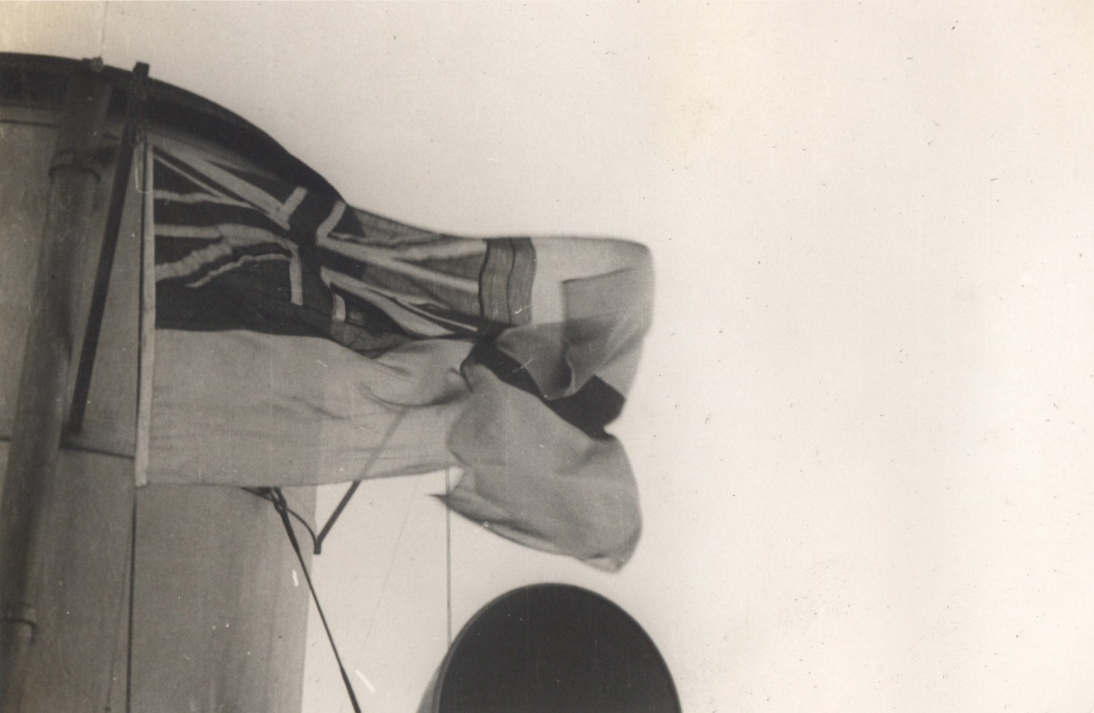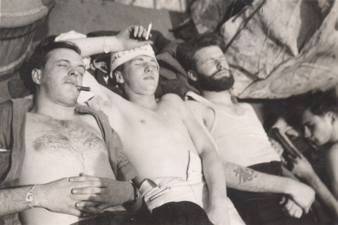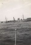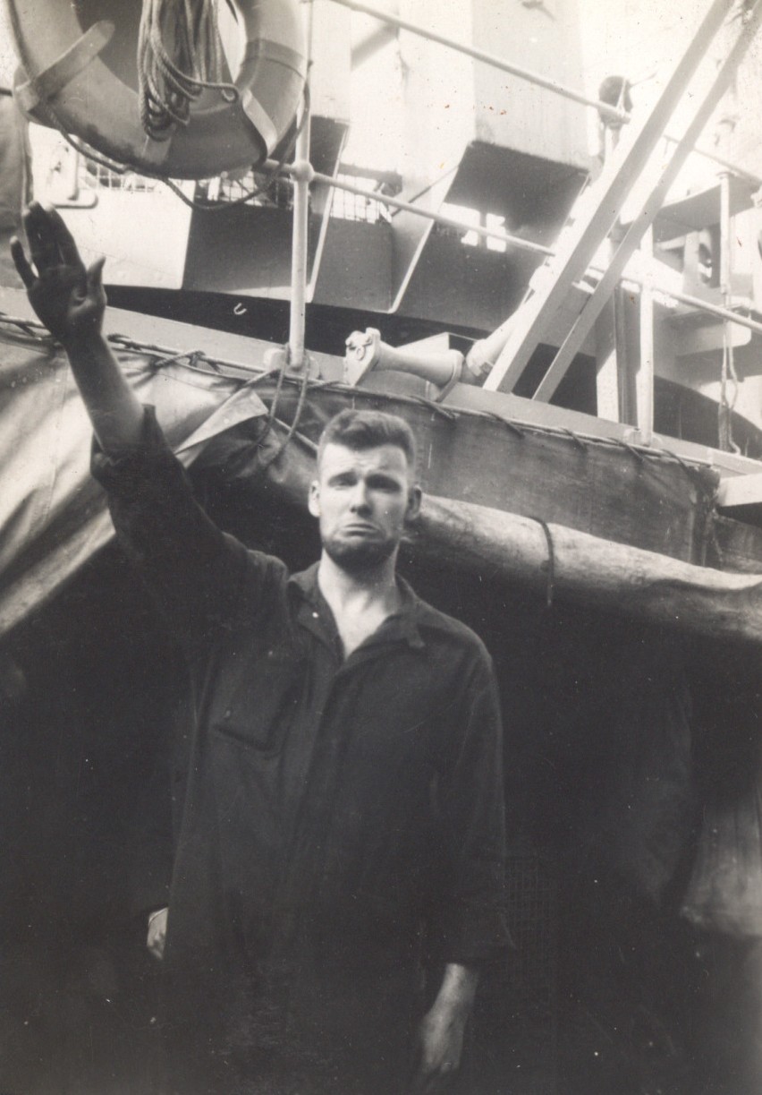 (RAS252) Looking somewhat dejected, an unknown sailor giving a Nazi salute on HMCS MORDEN K170 (RAS253) The White Ensign flying on HMCS MORDEN K170 (RAS254) Sailors in the aft gun tub on HMCS MORDEN K170. Ross (Sandy) Somerville 3rd from left. Remainder unknown (RAS255) Sailors in the aft gun tub on HMCS MORDEN K170. Ross (Sandy) Somerville, standing 3rd from left. Remainder unknown (RAS256) Buck Rogers, Carl Halstead and Ross (Sandy) Somerville relaxing on HMCS MORDEN K170