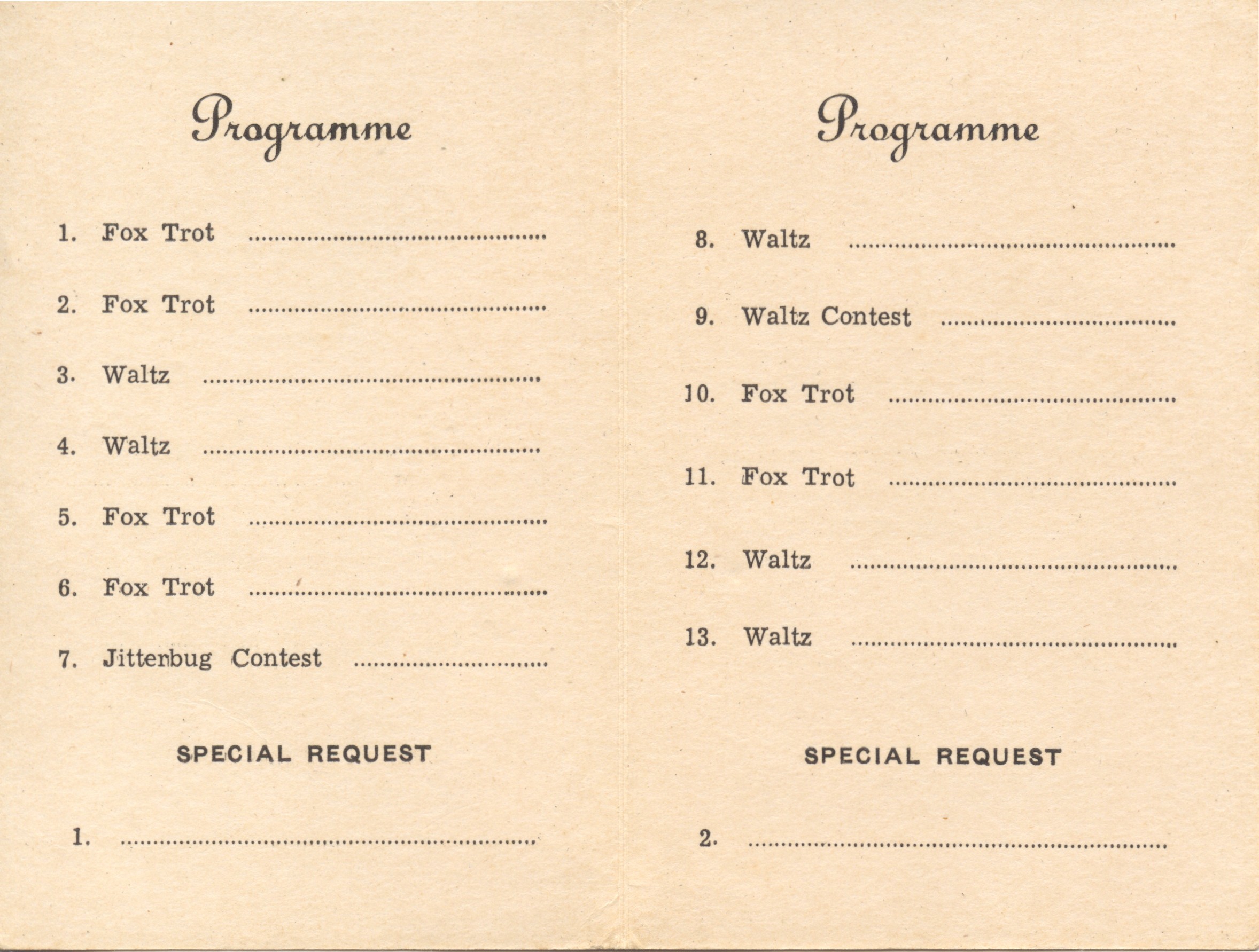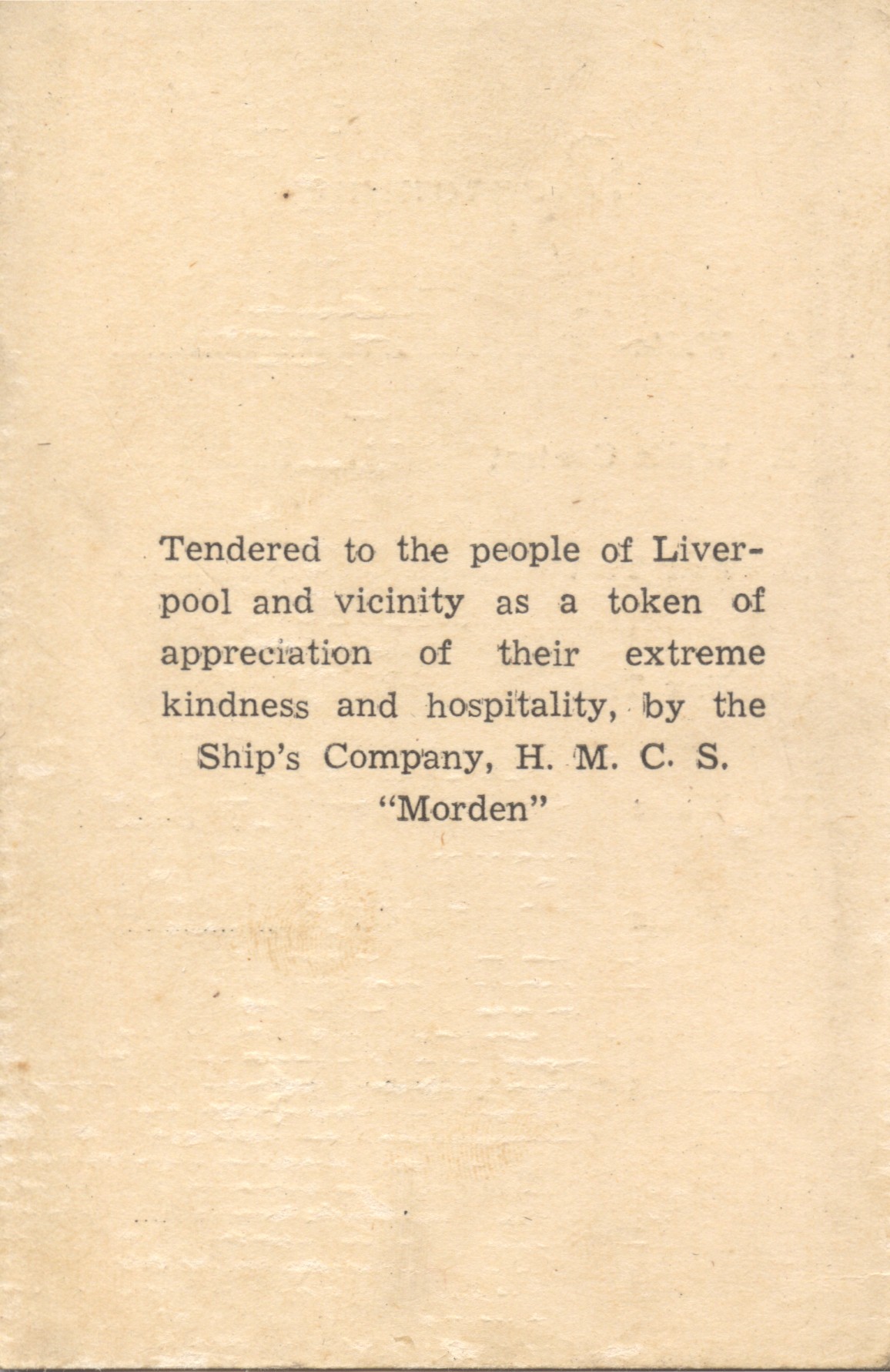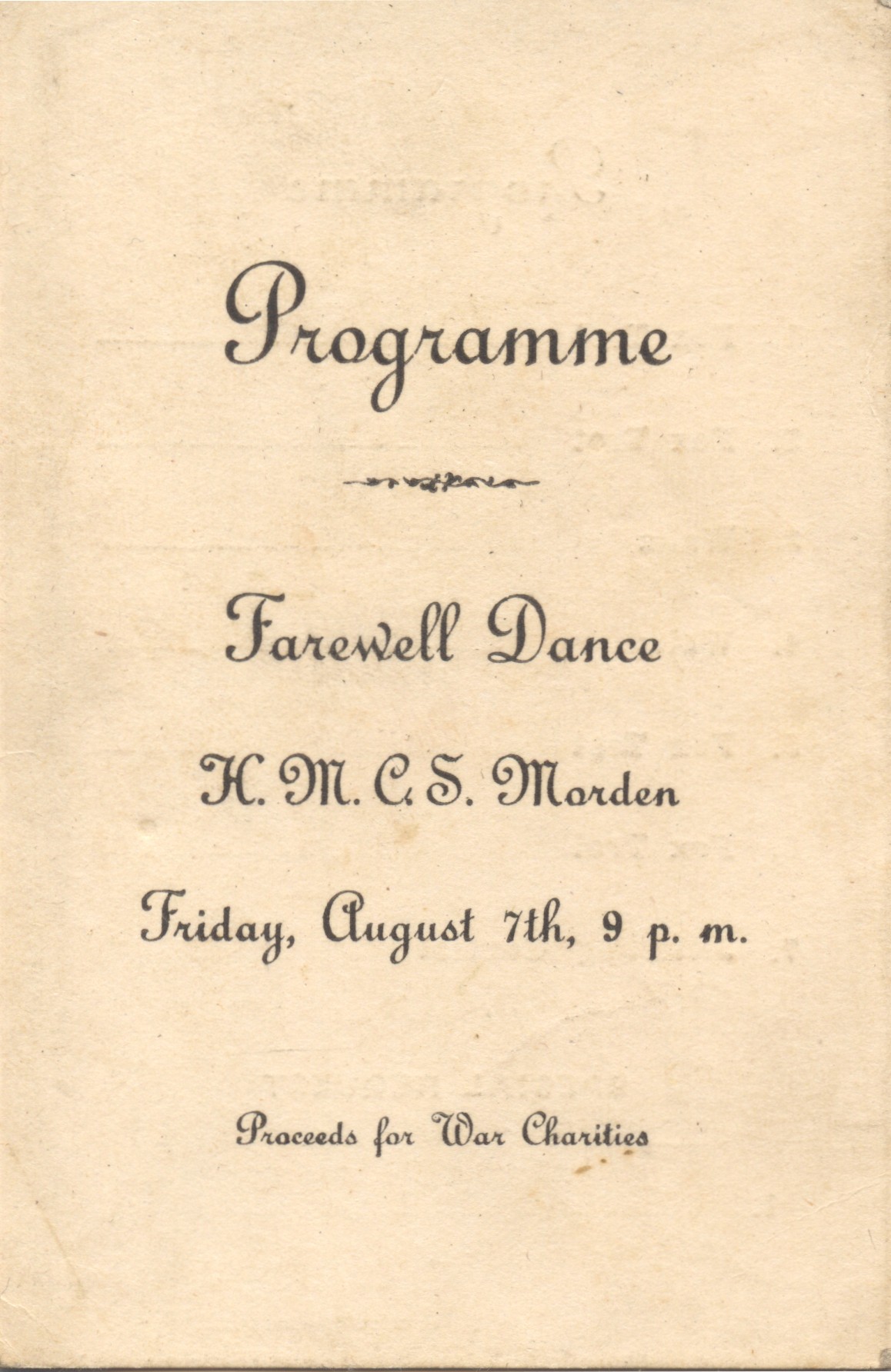(RAS295) Programme for HMCS MORDEN'S farewell dance for the people of Liverpool and surrounding area - Dated 09 August (no year listed) From the collection of Ross Somerville, Leading Coder, RCNVR Courtesy of Kathy Somerville