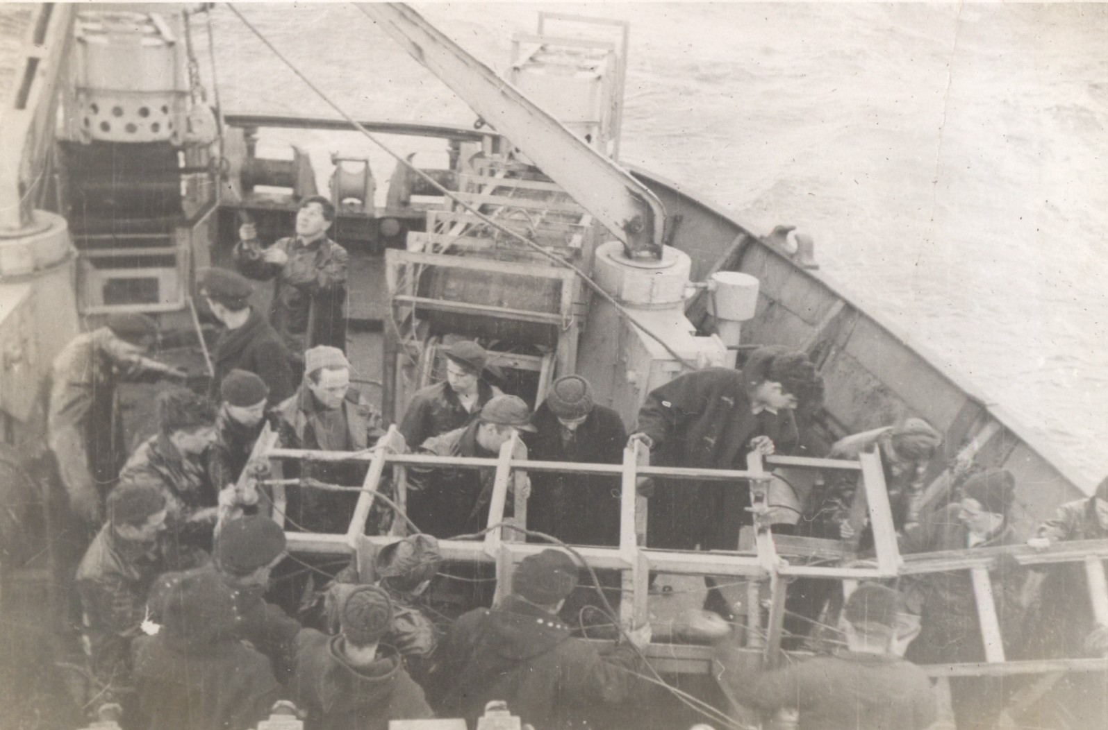 (LR09-LR12) Survivors from SS Winnipeg, sunk by U-443 on 22 Oct 1942, rescued by HMCS MORDEN K170