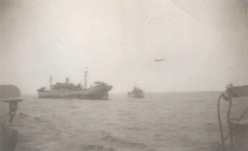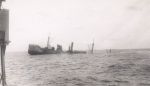 (RAS277-RAS279) HMCS MORDEN K170 steaming past a merchant ships moving in the opposite direction. In the second photo, after she has passed it, you see another corvette and above it an aircraft