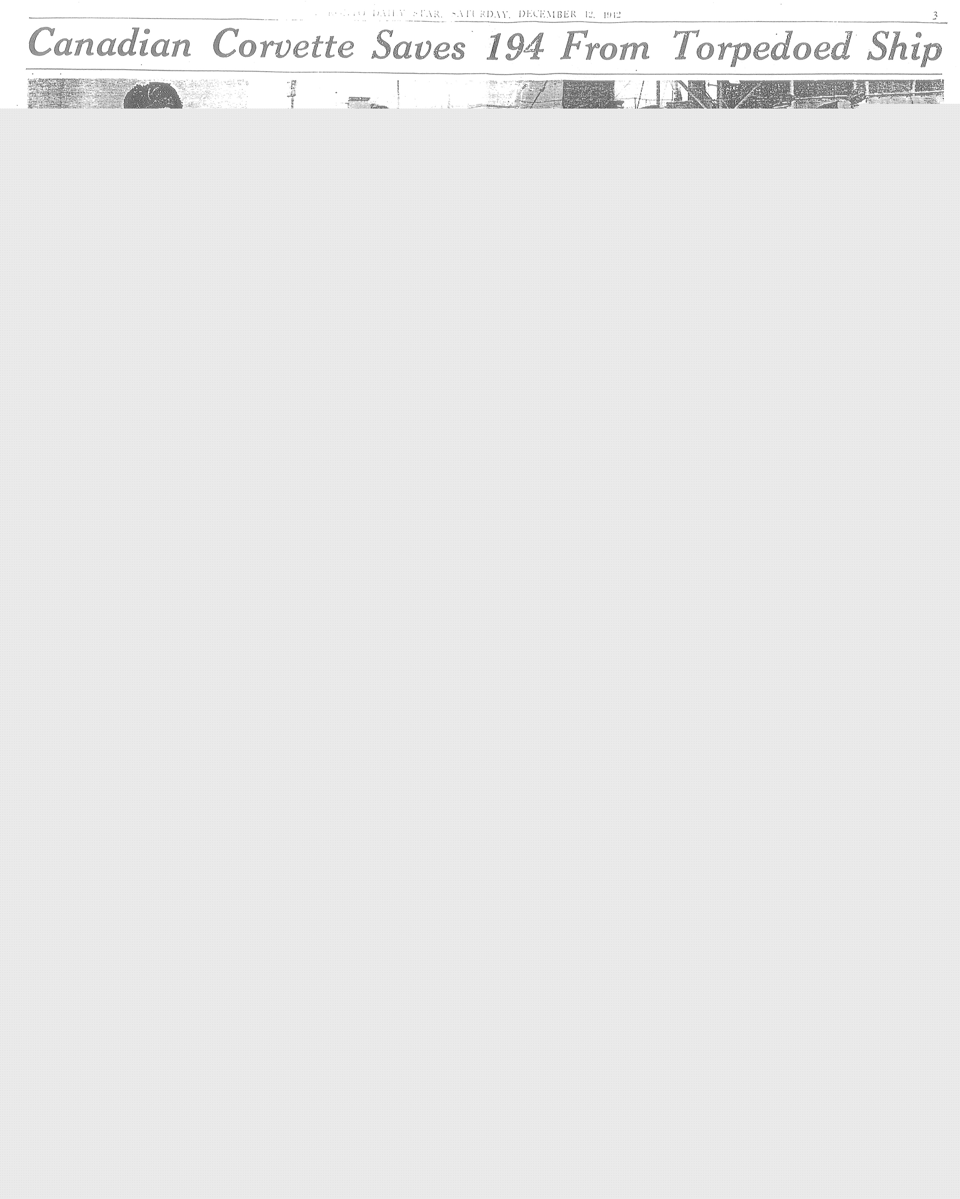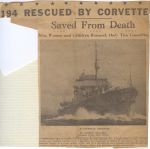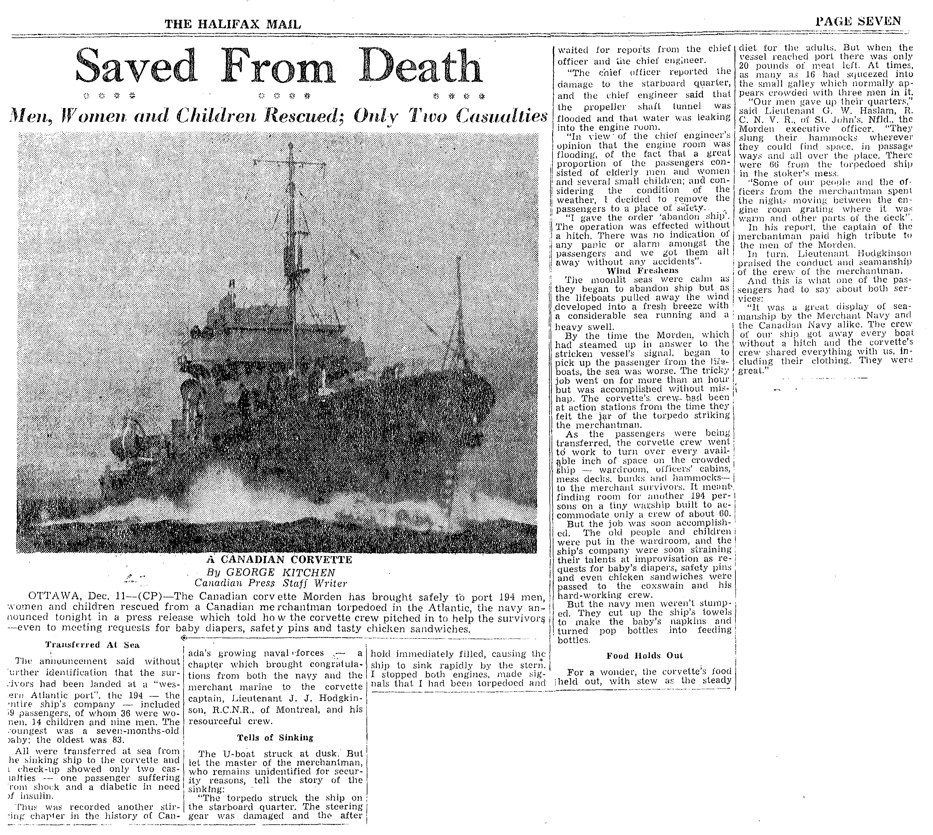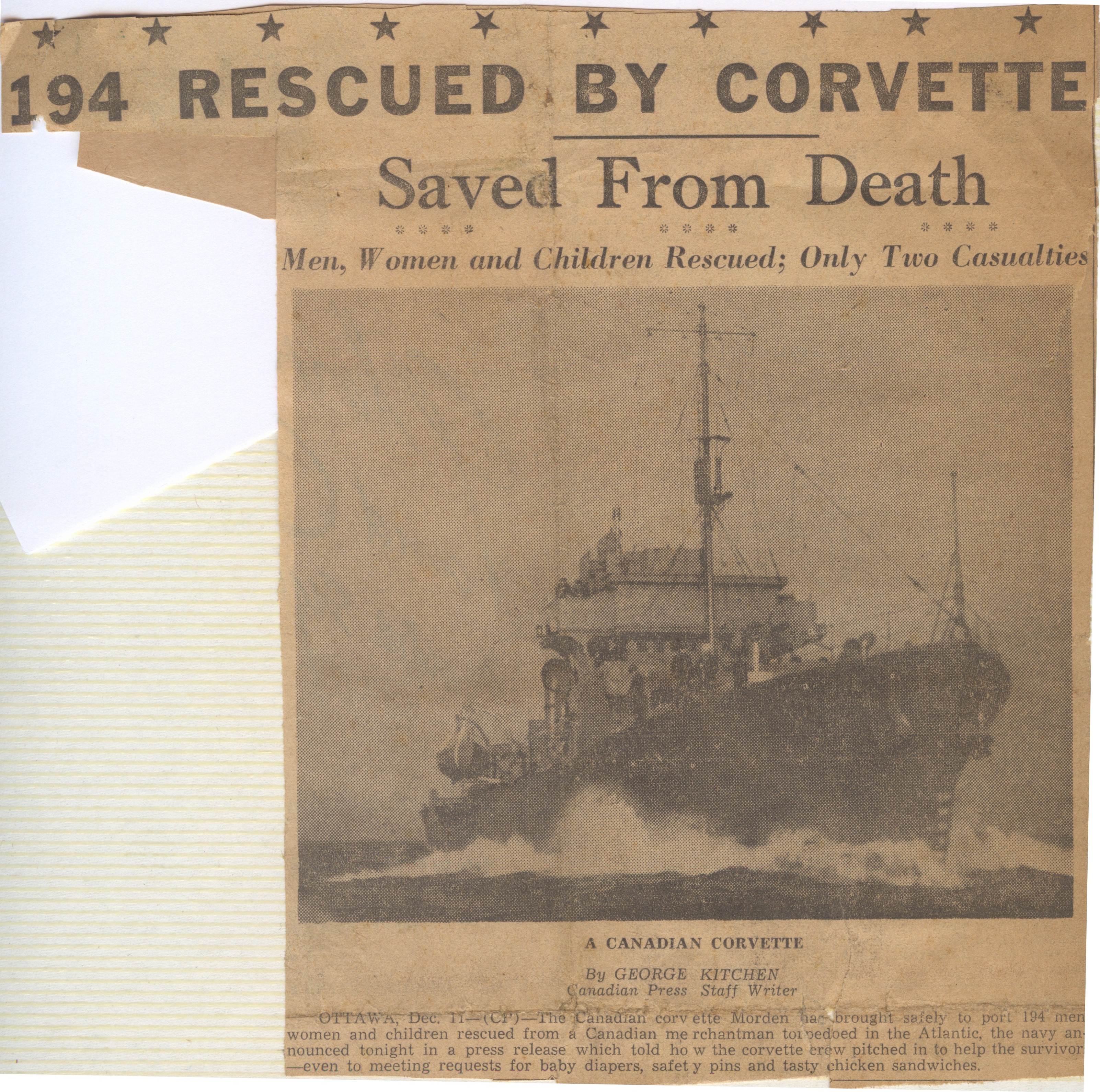 (RAS198-RAS200) Three Newspaper articles on HMCS MORDEN K170 rescuing the passengers and crew of the torpedoed SS WINNIPEG (RAS201) Lt Donald Sutherland, along with his friend SLt James George, were on the SS WINNIPEG II when she was torpedoed and sunk on 22 Oct 1942 by U-443. This is Donald's story. // Donald's write-up came from the collection of Ross (Sandy) Somerville. It is not known where Ross got it from. // Also mentioned was Donald's friend Pat Henry, SLt, RCNVR, who was at HMCS AVALON when they arrived there on the MORDEN.
