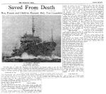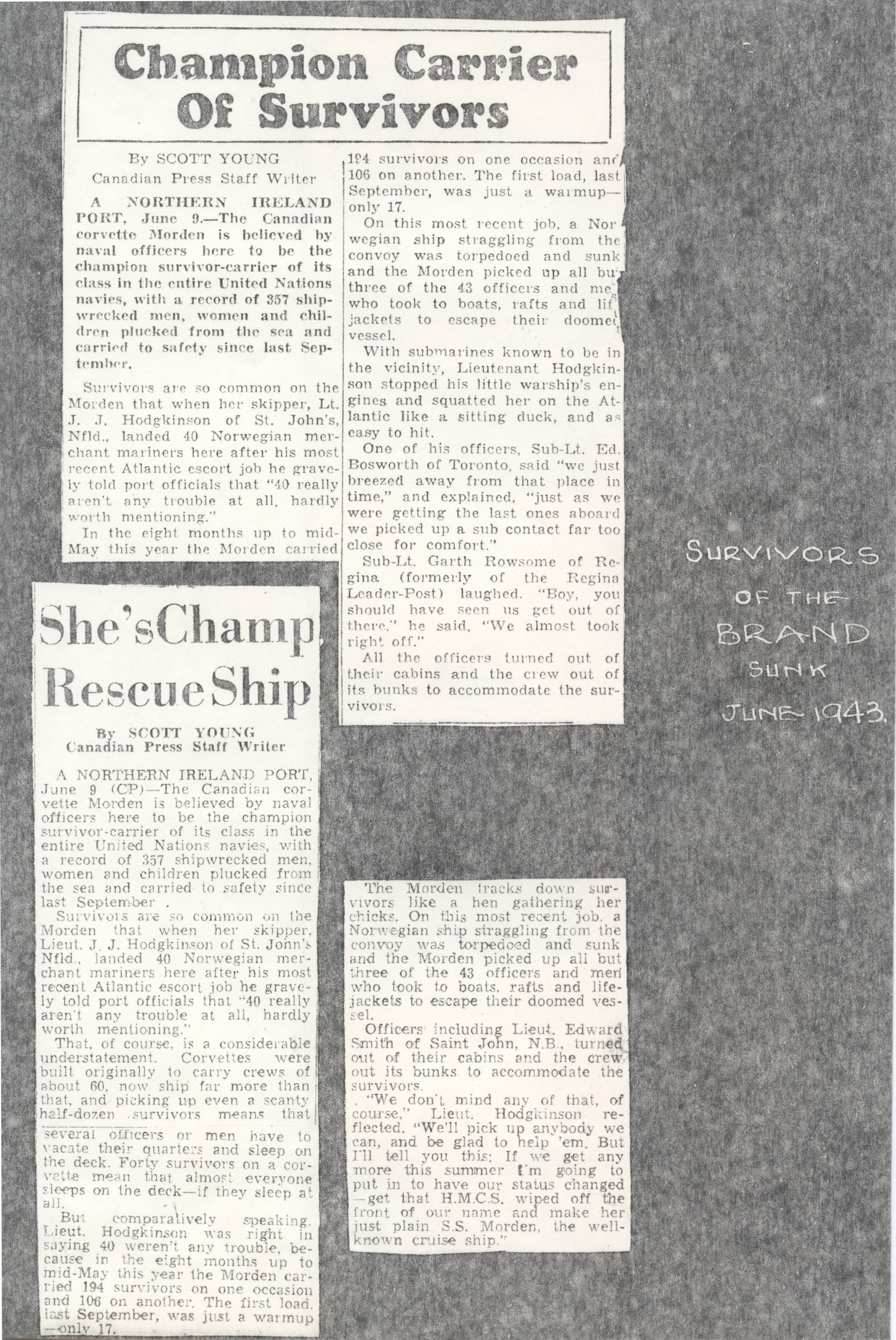 (RAS269) M/S BRAND'S lifeboats under sail - about to be picked up by HMCS MORDEN K170. (RAS270) Two newspaper articles - one on the rescue of the BRAND'S crew and the other on MORDEN'S history of rescues. * These photos and articles were sent to Ross Somerville by Bill Sloan.
