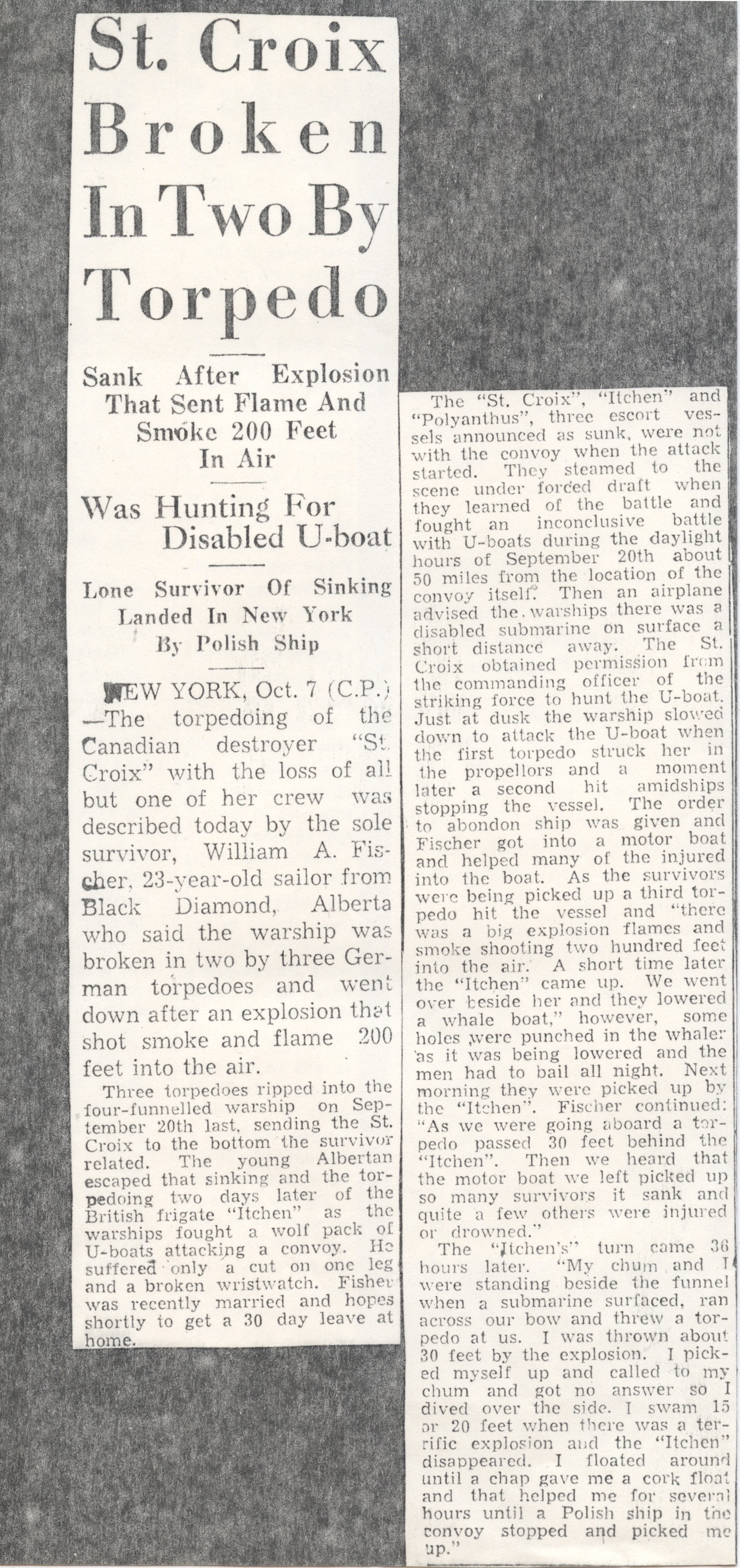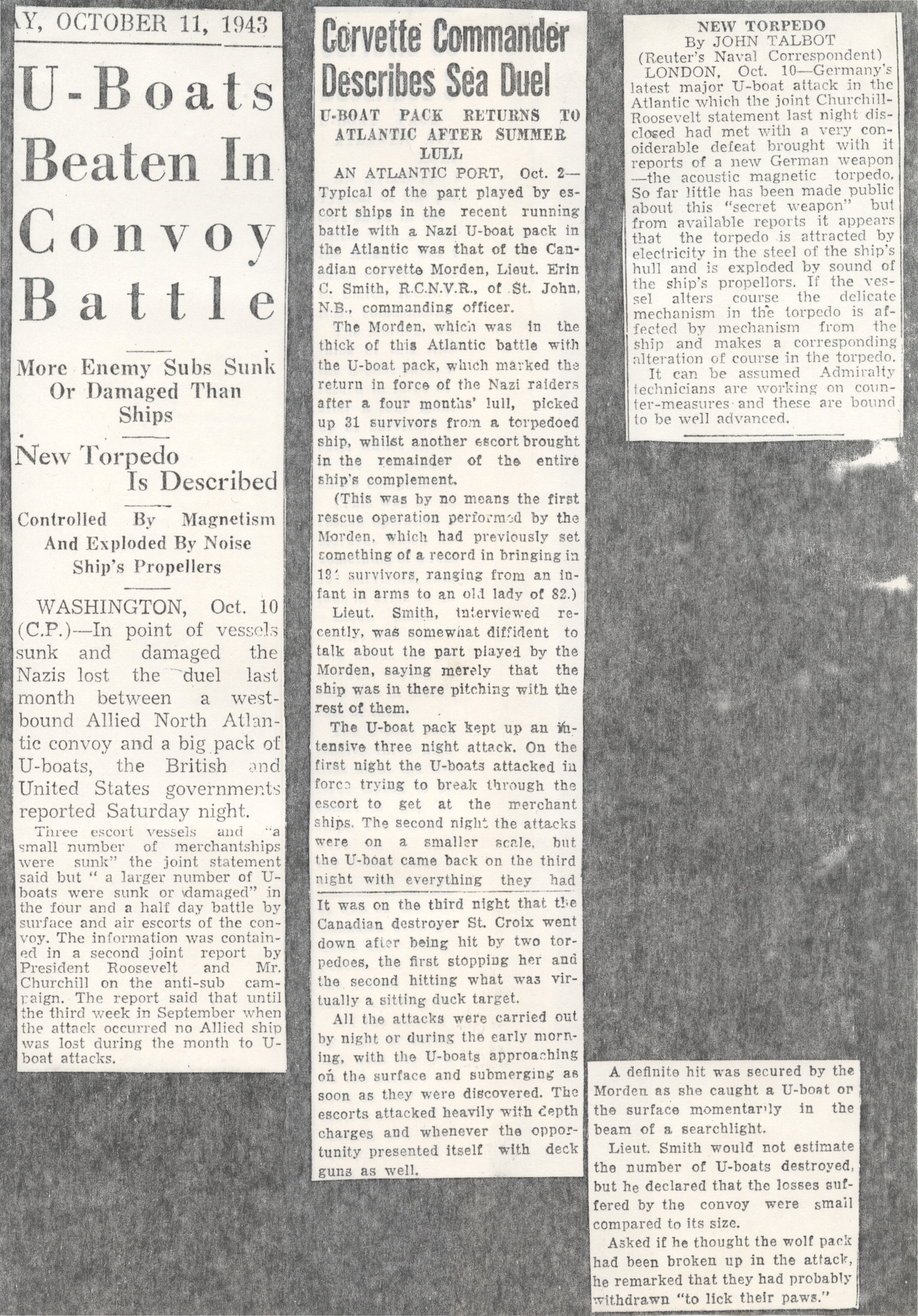 (RAS284) Article on the loss of the ST CROIX on 20 Sep 1943 during Convoy ON.202 as told by her sole survivor William Fisher * (RAS285) Articles on the battle for Convoy ON.202 and HMCS MORDEN'S part in the battle * (RAS286) "Christmas Festival" - birth of an era // A summary of the Attack on Convoy ONS.18 and ON.202 * These articles were sent to Ross Somerville by Bill Sloan.