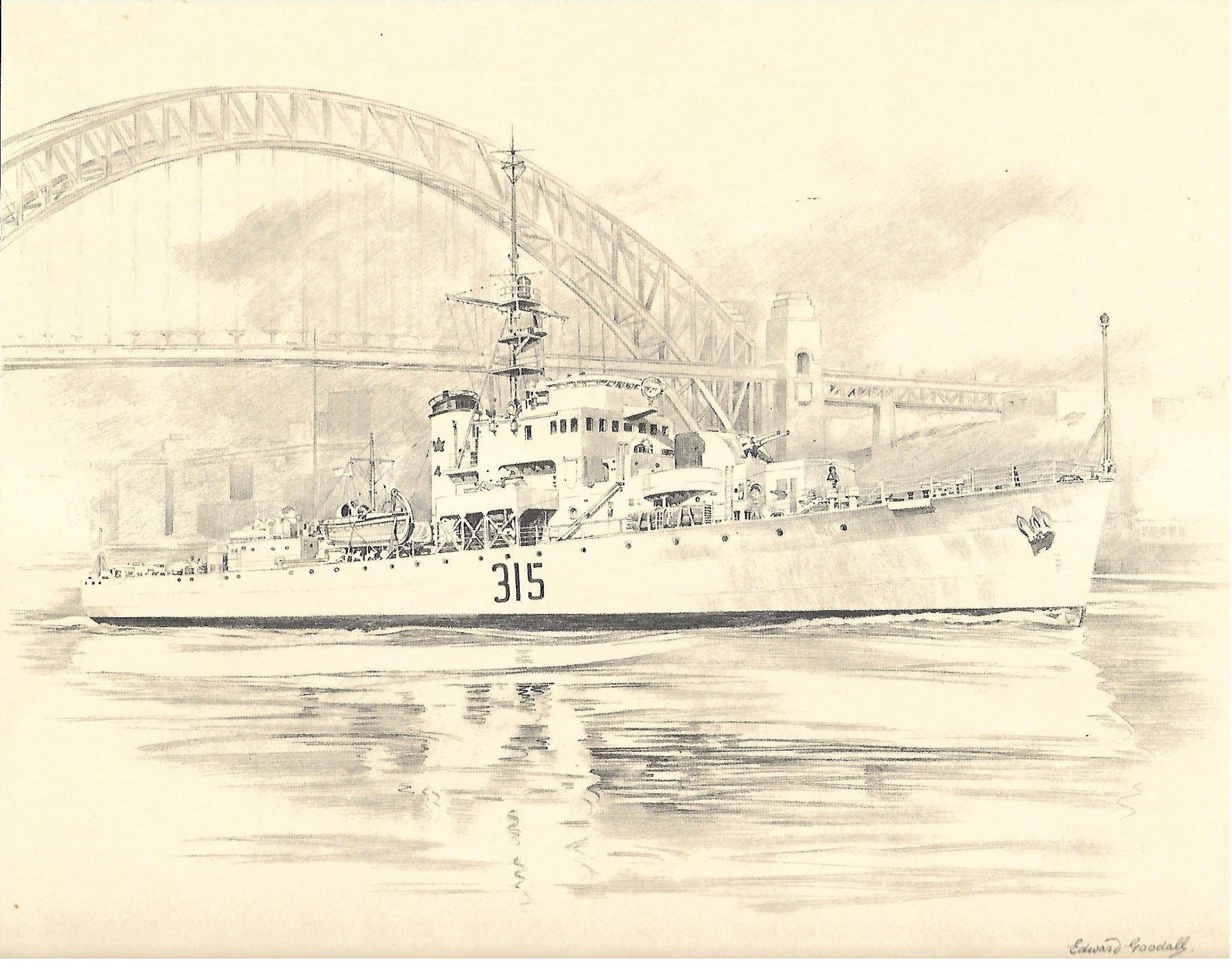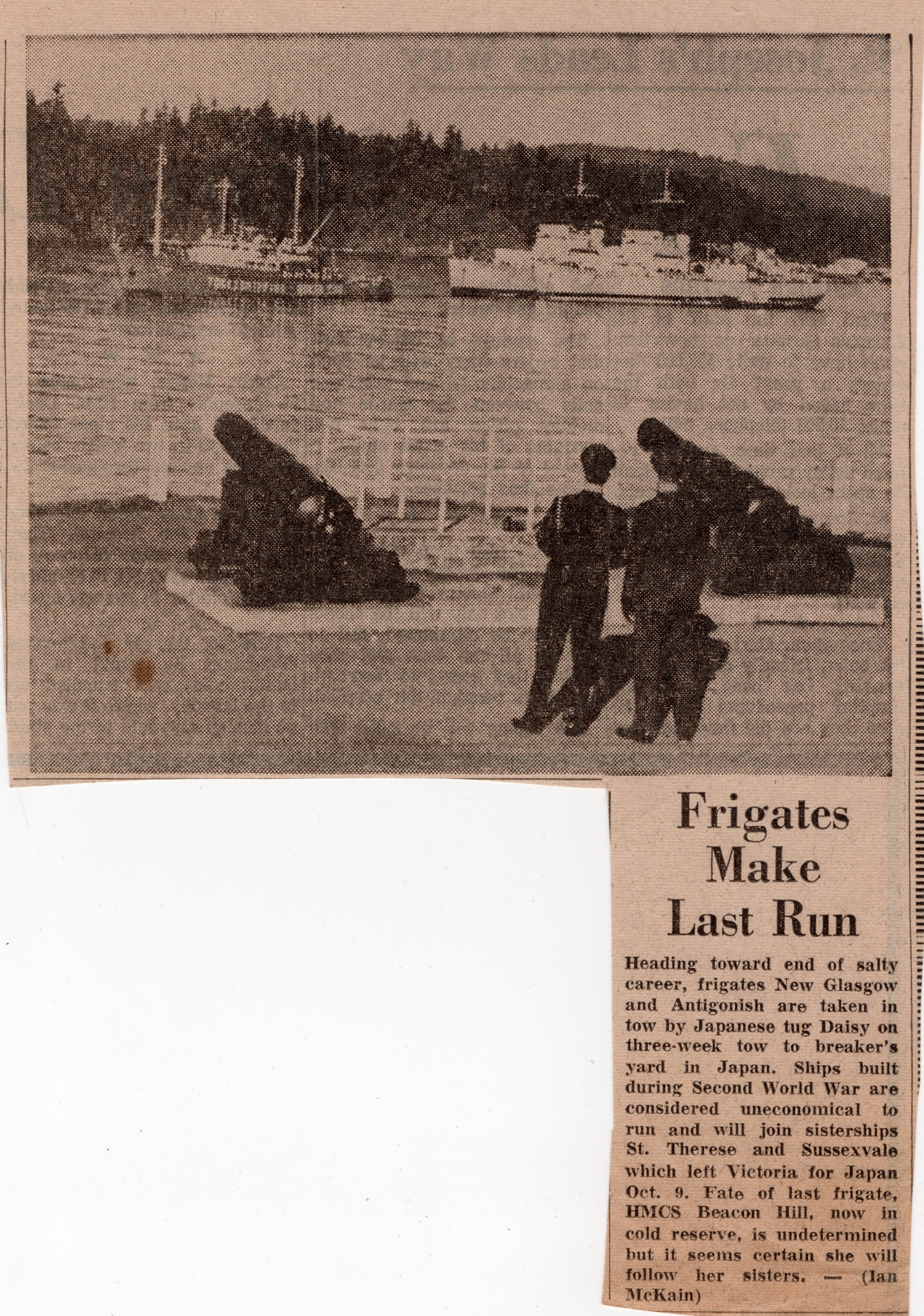 (RB017) Sketch of HMCS NEW GLASGOW 315 leaving Sydney, Australia, Spring 1961 by Edward Goodall (RB018) Undated article - The former HMCS NEW GLASGOW and HMCS ANTIGONISH depart Esquimalt under tow to the breaker's yard in Japan Courtesy of Robert Berbeck