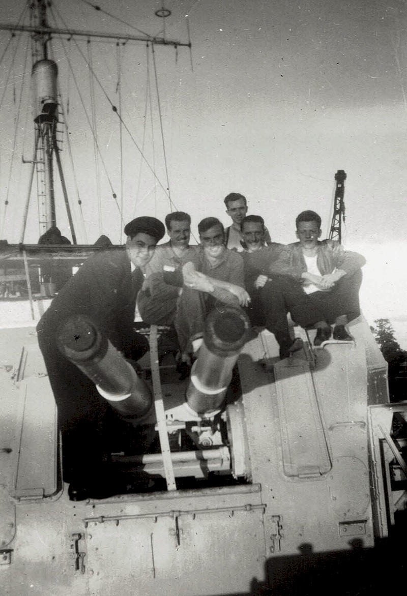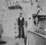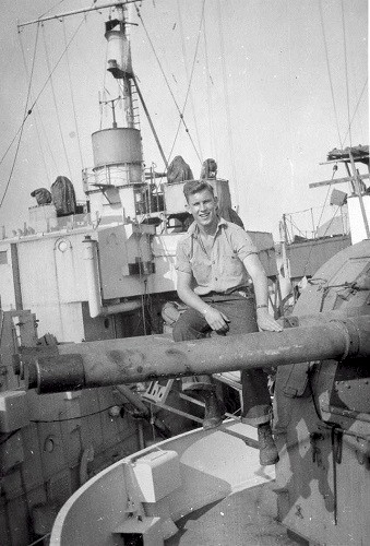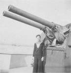 Larry Restall by the 4-inch guns on HMCS New Waterford K321