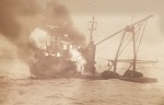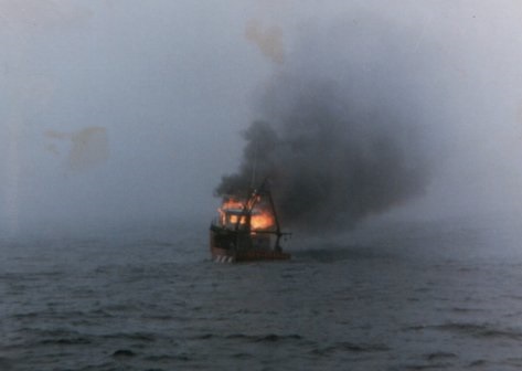 (NPG016) The fishing vessel Lady Marjorie on fire after being hit by numerous HE rounds from HMCS NIPIGON  //  Courtesy of Michael Collacutt