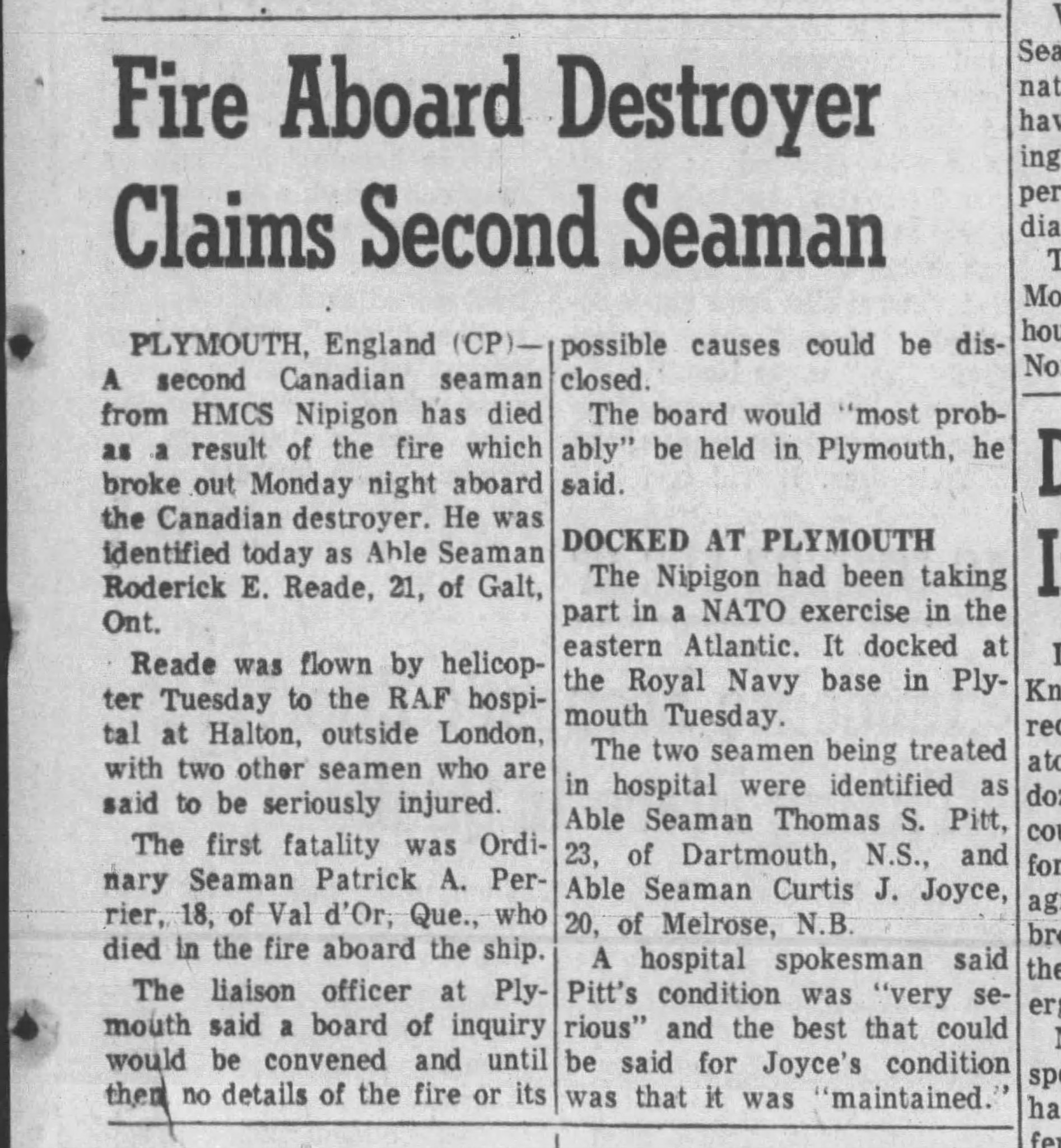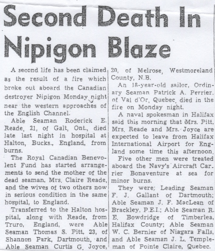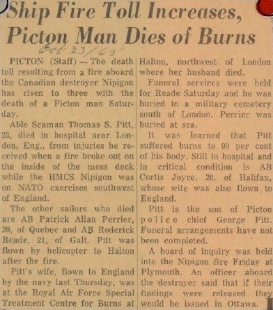 (NPG007 - NPG008) Article on the death of 2 of NIPIGON'S crew, Roderick Reade and Patrick Perrier, from the fire on 18 Oct 1965
