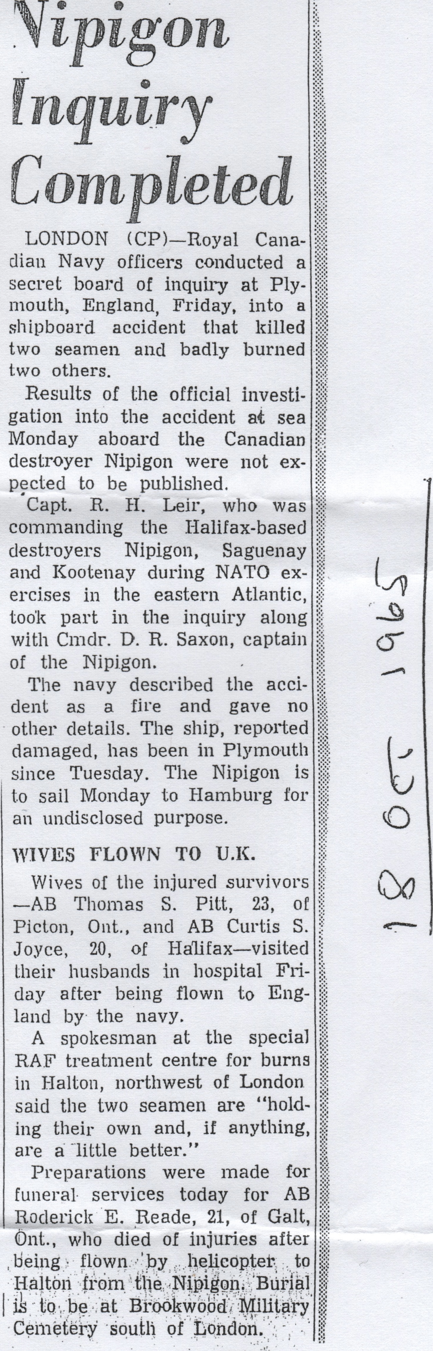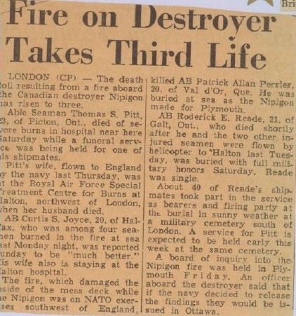 (NPG006) Article on the fire and explosion on board HMCS NIPIGON 266 on 18 Oct 1965