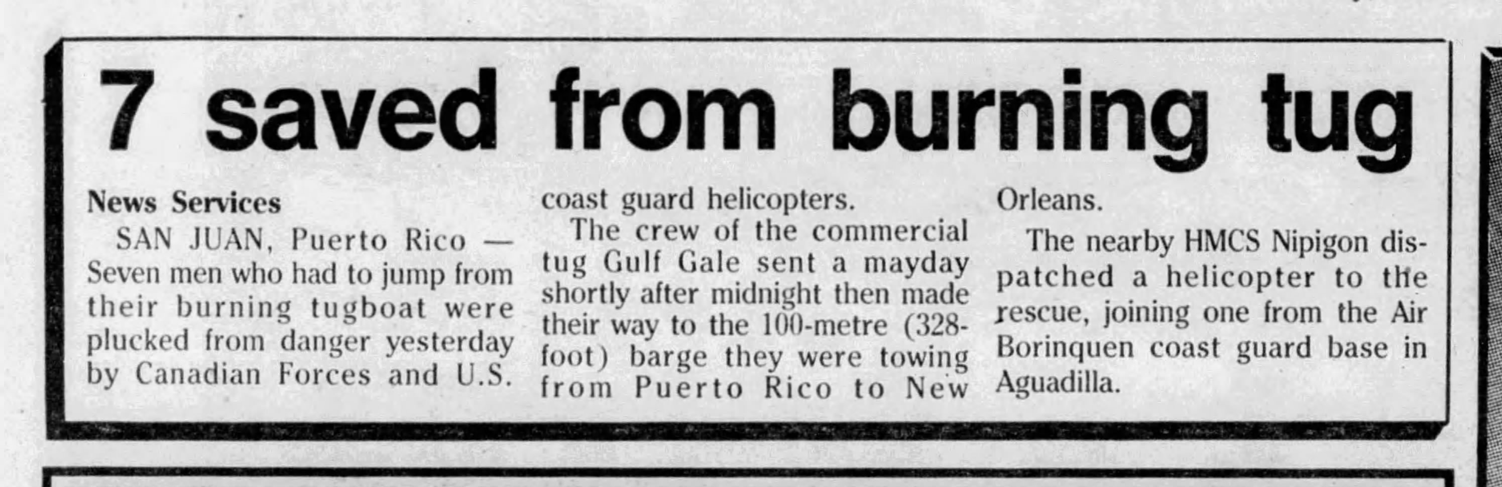 On 22 Feb 1987 HMCS NIPIGON'S helo assisted in the rescue of the crew from the burning tug Gulf Gale off Cabo Rojo, Puerto Rico.