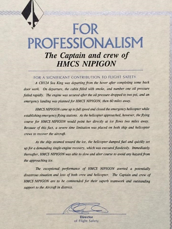 (NPG018) Letter to crew of HMCS NIPIGON 266 for their professionalism during an Sea King flight emergency  //  Courtesy of Jeff Eastham