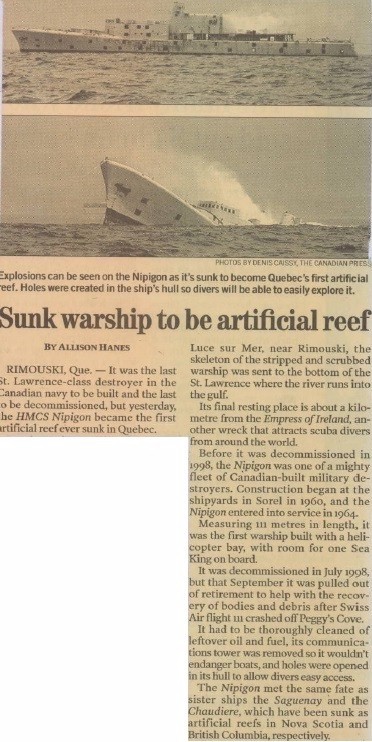 (NPG103) Sunk warship to be artificial reef  //  Newspaper article on the sinking of the former HMCS NIPIGON as an artificial reef near Rimouski, Quebec.  //  Courtesy of Terrie Robinson
