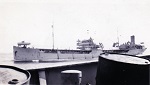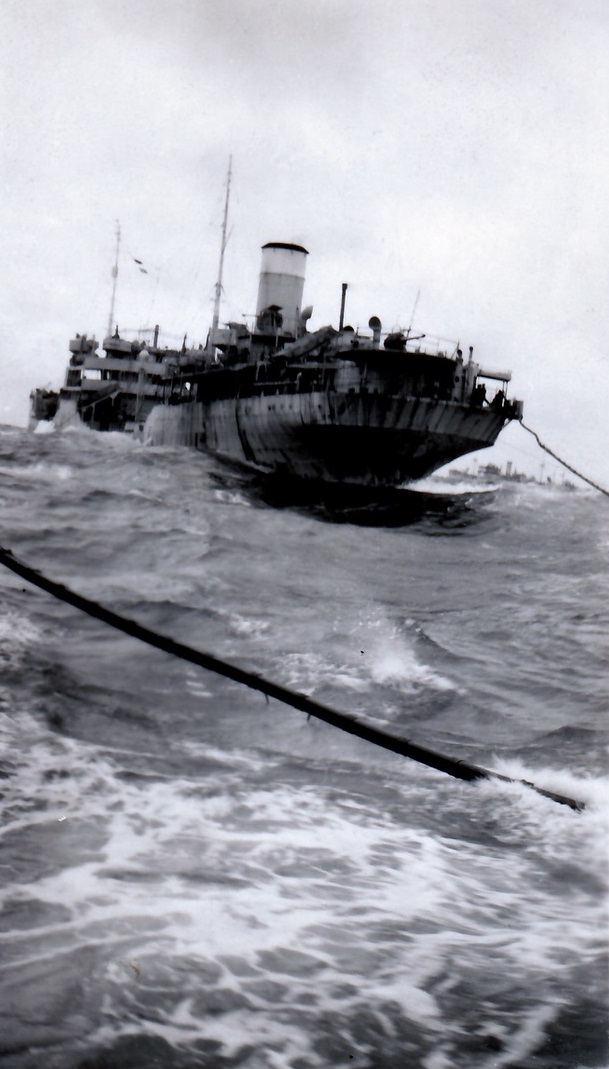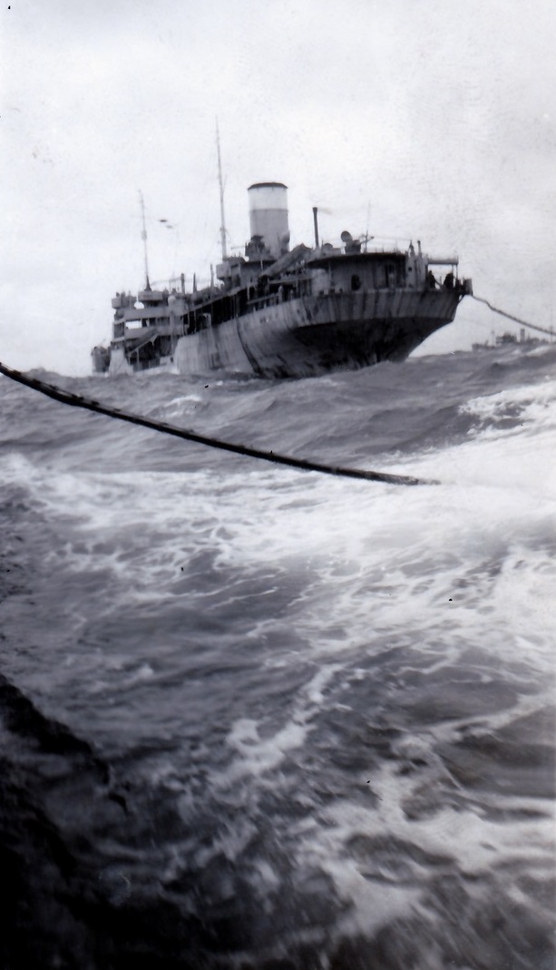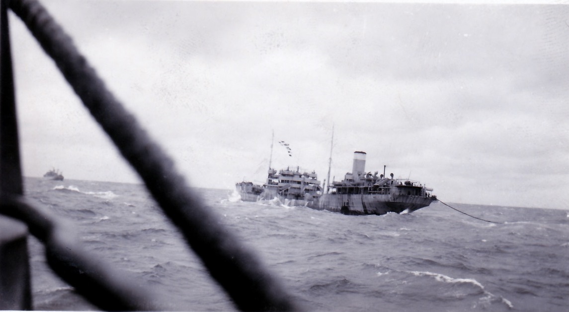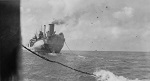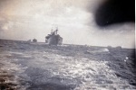 (DJ17-DJ20) HMCS NORTH BAY K339 fueling while in convoy on two different occasions DJ17-18 and DJ19-20 (DJ17) Taking up station for oiling (DJ18) NORTH BAY astern of oiler (DJ19) Heaving line - attached to heavier cable and then fuel line - being hauled in to NORTH BAY (DJ20) Fuel line connected to NORTH BAY