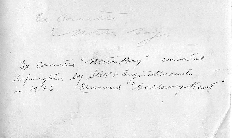 Built at Collingwood, she was commissioned there on 25 Oct 1943. NORTH BAY arrived at Halifax on 29 Nov 1943, and in Dec 1943 carried out workups in St. Margaret's Bay. On completion of these she was assigned to EG 9, Londonderry, making her passage there as escort to convoy SC.154 early in Mar 1944. When EG 9 became a frigates-only group, NORTH BAY returned to St. John's in Apr 1944 and became a member of EG C-4. From 11 Dec 1944 to mid-Feb 1945, she underwent a refit at Sydney and proceeded to Bermuda to work up. On completing this exercise she sailed directly to St. John's to join EG C-2, but later in Apr 1945 she was transferred to C-3 and, on 30 Apr 1945, left St. John's to join convoy SC.174 for a final trip to Londonderry. She returned in May 1945 with ON.304 and was paid off on 01 Jul 1945 and laid up at Sorel. In 1946 she was sold for merchant service and became the Bahamian Kent County II; renamed Galloway Kent in 1950; renamed Bedford II in 1951.