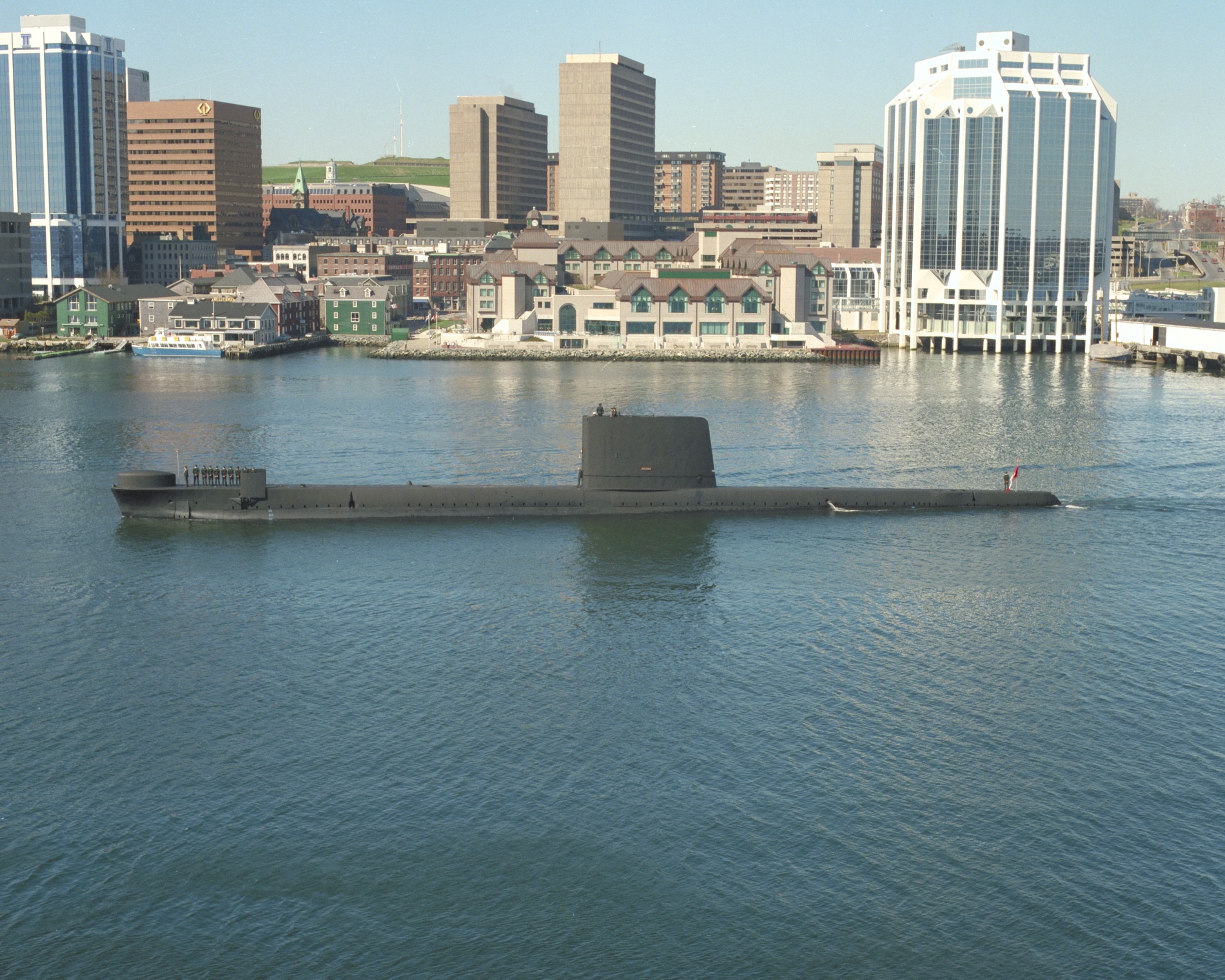 HMCS OJIBWA passing the downtown Halifax waterfront -