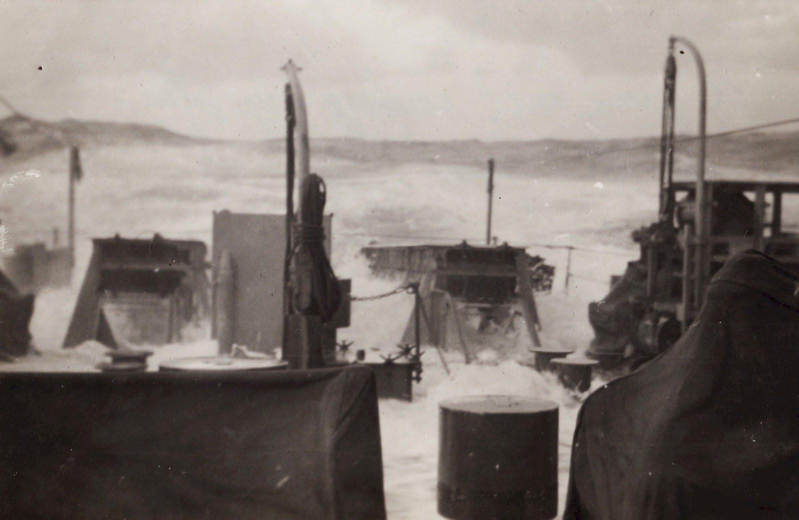 Quarterdeck of HMCS Orkney K448 awash in heavy seas