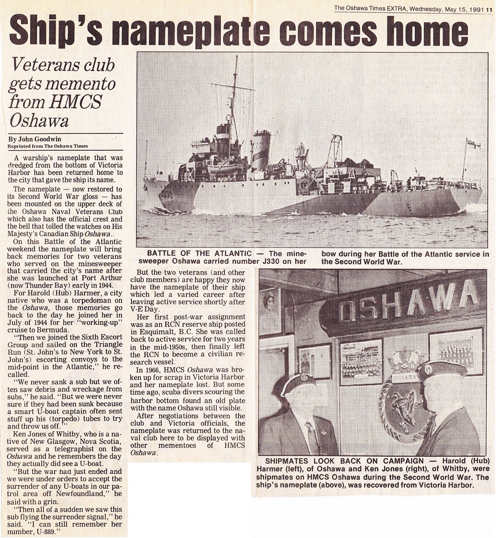 Former HMCS OSHAWA's nameplate found in Victoria Harbour