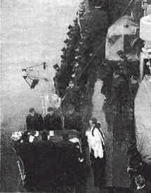OTD001 (OTD001) Final tribute, with full naval 'honors, was paid on board HMCS "Cayuga" to Lieut. Alexander C. Jones, RCN (R), (Ret'd), who died recently in Victoria. Lieut. Jones, a former Merchant Service officer, was in charge of the Chart Depot in HMC Dockyard, Esquimalt, at the time of his death. During the war he commanded the minesweeper "OUTARDE" on the west coast. Above, as the pallbearers stand with bowed heads and the funeral firing party rests on its arms reversed, Chaplain F. H. Godfrey reads the burial service before the body is committed to the deep. Source: CROWSNEST Magazine, Vol. 2, No. 4, February, 1950