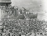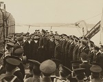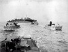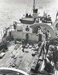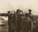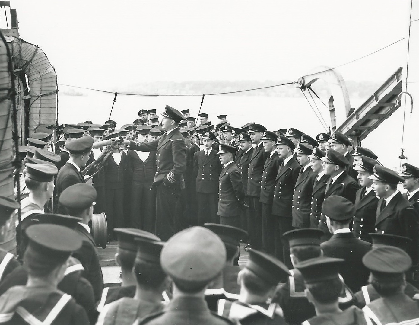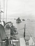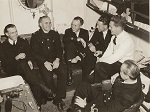 (WW31) William Welsh (centre) having birthday cake in mess aboard HMCS PRINCE DAVID, Portsmouth Harbour before D-Day on 05 Jun 1944 (WW32) Capt. Kelly addresses ship's company on HMCS PRINCE DAVID on D-Day - LAC PA211353 (WW33) HMCS PRINCE DAVID'S battle ensign on D-Day - LAC PA143815 (WW34) HMCS PRINCE DAVID anchored off Omaha Beach. There is a signalman on the flag deck holding on to a halyard - LAC PA211354 (WW35) LCT loaded with troops on D-Day - LAC PA211352
