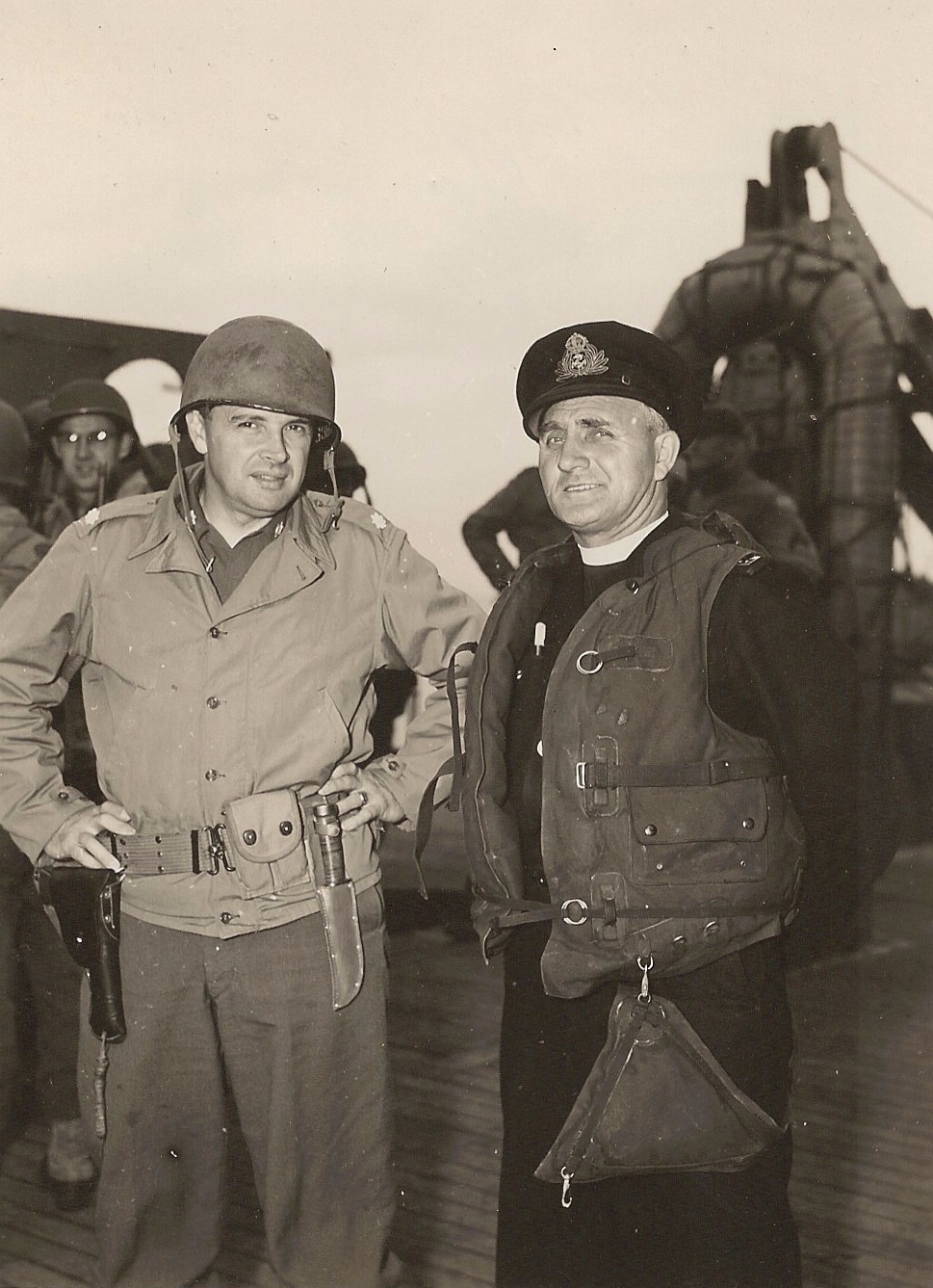 (GG22) Capt. Norris, RN Combined Ops. Specialist. Sailed on P.D. [Prince David] as C.O. of a group LSI (M) Invasion of South/France July ’44 later killed in mine explosion on beach Yugoslavia Photo PA143812 from Library and Archives Canada (GG23) Ammunition boxes being loaded on to PRINCE DAVID's landing craft LCA 1115 (GG24) Unidentified sailor touching up the Maple Leaf on one of PRINCE DAVID's LCAs (GG25) Lea Gillard (right) with Lt. Col. US Army Engineers - 05 Jul 1944