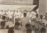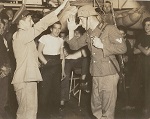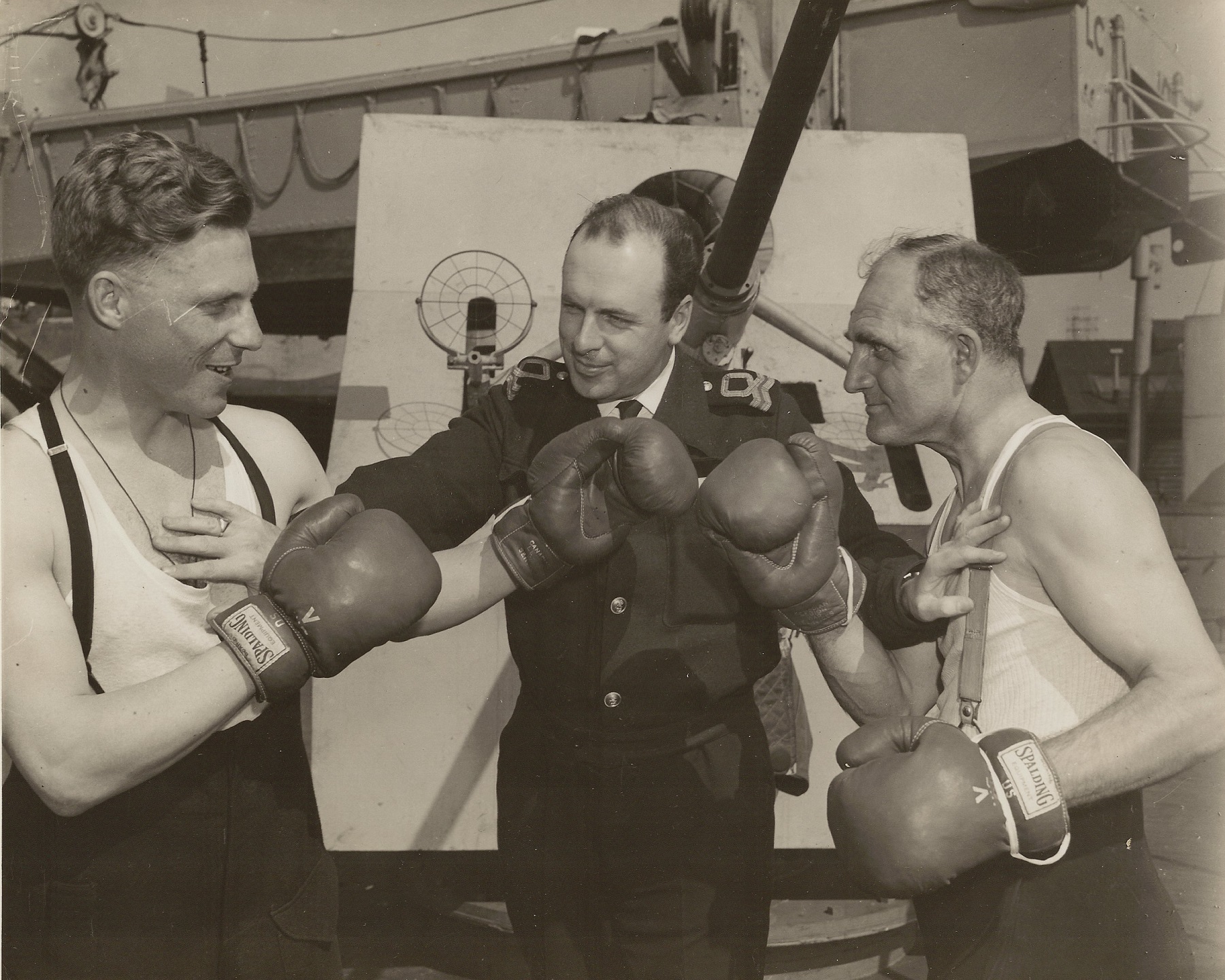 (GG13) A boxing match on HMCS PRINCE DAVID - Padre Lea Gillard on right; Dr. John Beggs as referee (GG14) Cdr Thomas D. Kelly addressing the PRINCE DAVID's crew (GG15) soldiers boarding the landing craft on HMCS PRINCE DAVID (GG16) Soldiers in one of PRINCE DAVID's landing craft (GG17) Ashore in unknown location. Padre Lea Gillard front row in naval uniform