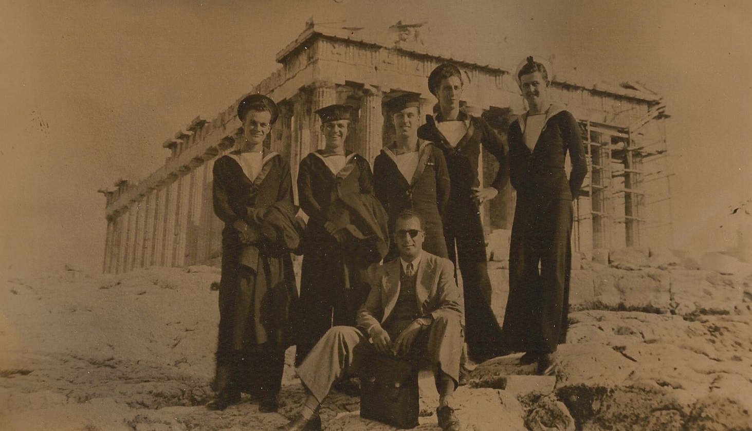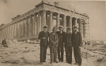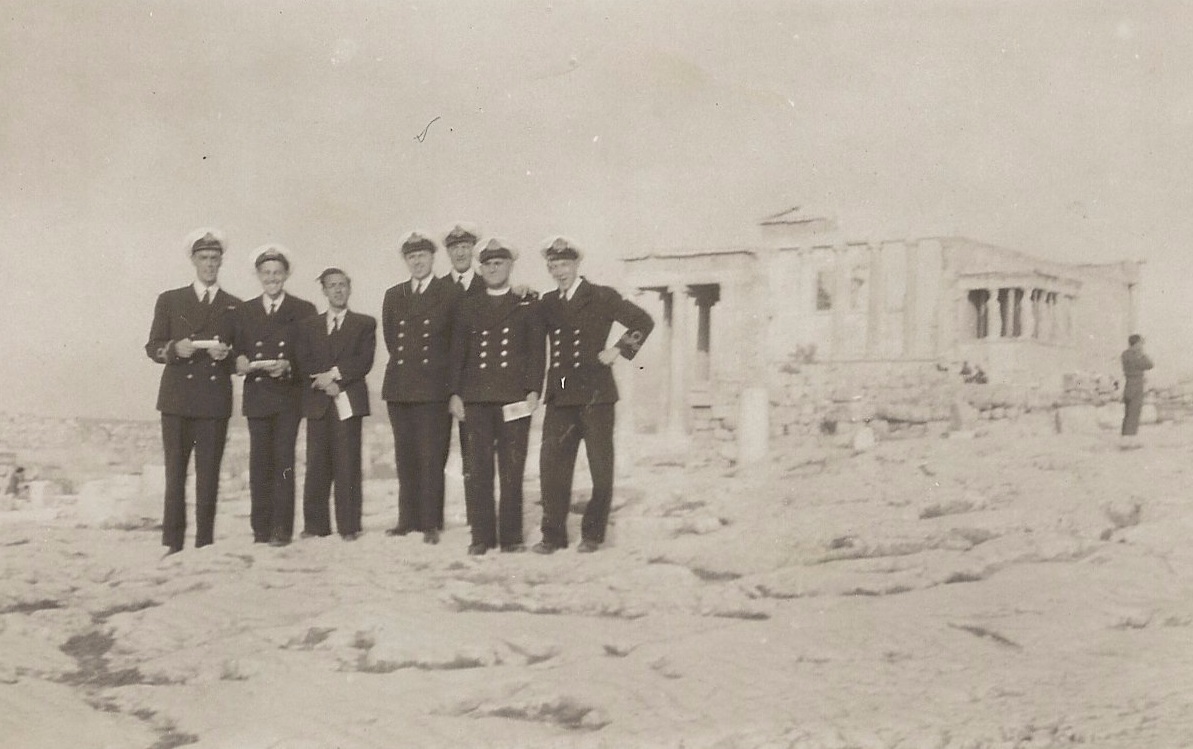 Some of HMCS PRINCE DAVID'S crew ashore in Athens - circa fall of 1944 - both taken in front of the Parthenon. These photos were printed as post cards but were not sent. (GG26) Rev. Lea Gillard 2nd from right (GG27) L-R: Jacko Killeen, Ottawa; Keith Brason, Calgary; “me”, no name given; Charles Joyce, Port Credit; Tom Emerson, Moose Jaw; and, Qui Guiele (?), the guide