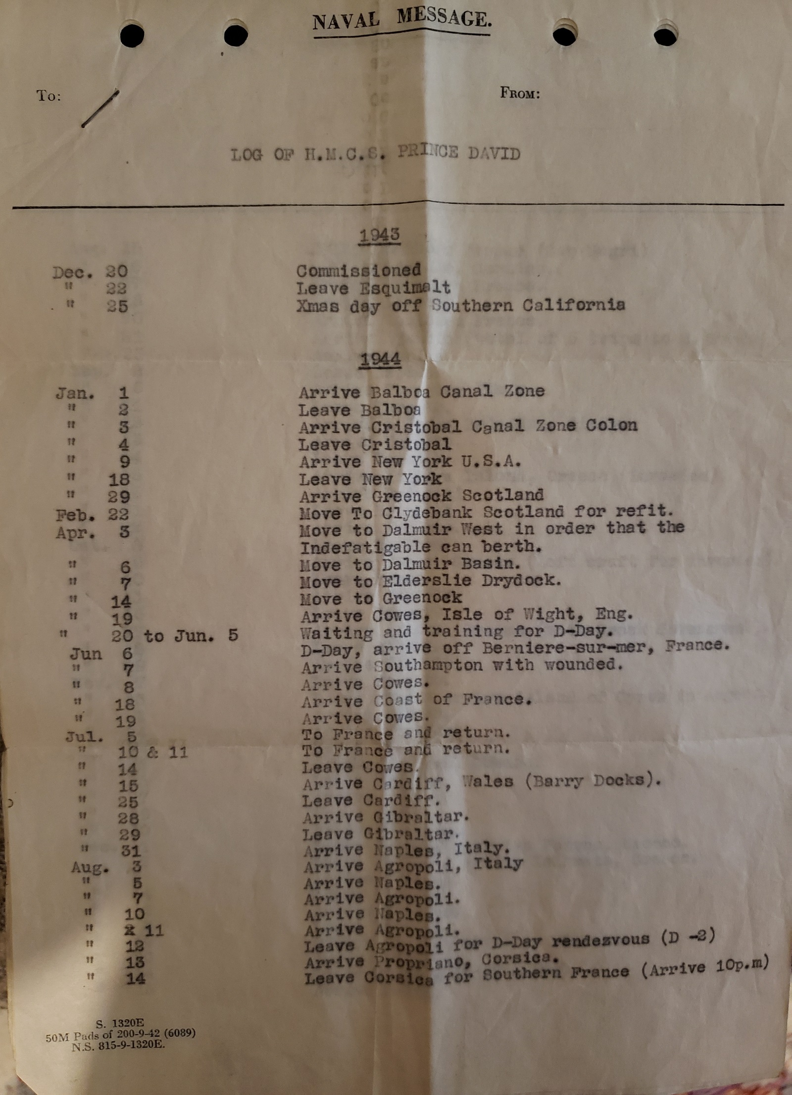 Record of Ship's movements HMCS PRINCE DAVID 20 Dec 1943 - 01 Mar 1945