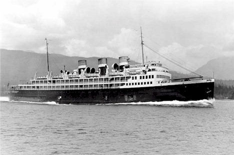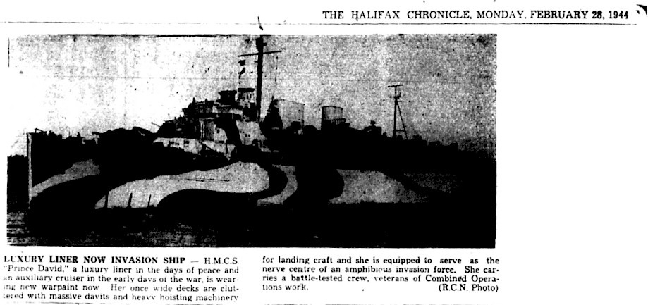 Formerly a three-funnelled Canadian National Steamships liner, she was purchased on 19 Dec 1939, and after very extensive conversion commissioned at Halifax on 28 Dec 1940, as an armed merchant cruiser. After working up at Bermuda in Jan and Feb, 1941 PRINCE DAVID was assigned to the RN's America and West Indies Station for the rest of the year. That December she was transferred to Esquimalt and in May, 1942, after refit at Esquimalt and Vancouver, joined Esquimalt Force. During her refit, scenes from the 1942 film Commandos Strike at Dawn were filmed using PRINCE DAVID and Nenamook. From Aug to Nov she served under USN control in the Aleutian campaign. She then resumed her former duties out of Esquimalt until the beginning of Mar 1943, when she was paid off for conversion to an infantry landing ship. The rebuilding, which took place at Esquimalt and Vancouver, was completed that December, and shortly after re-commissioning she left for the U.K. via Cristobal and New York. Upon arrival in the Clyde in Feb 1944, PRINCE DAVID joined Combined Operations Command, and landed troops in Normandy on D-Day. In Jul she left for the Mediterranean to take part in Operation "Dragoon," the invasion of southern France, on 15 Aug. She was extensive service in the Mediterranean until damaged by a mine on 10 Dec 1944, off Aegina Island, Greece. Repaired at Ferryville, North Africa, she left in Mar 1945, to refit at Esquimalt, but saw no further service was was paid off on 11 Jun 1945. Charlton Steam Shipping Co. purchased PRINCE DAVID in Sep 1946. By Feb 1947 PRINCE DAVID was in Britain undergoing conversions to her superstructure for passenger service. Renamed Charlton Monarch, she entered the immigrant trade and ran from Britain to Australia. PRINCE DAVID seemed to be predisposed to striking underwater hazards: in 1932 as CNSS PRINCE DAVID she spent six months hard aground on the North-East Breaker at Bermuda; in 1941, she was aground again in Bermuda; during her Alaskan tour, she struck an uncharted piling; and in the Mediterranean an exploding mine opened a 17-foot (5 m) hole in her plates. These events, plus the pre-war years of neglect, may have contributed to her early end. She lasted only 6 years and was broken up at Swansea in 1951.