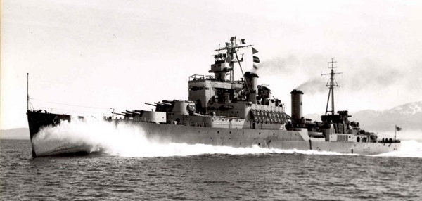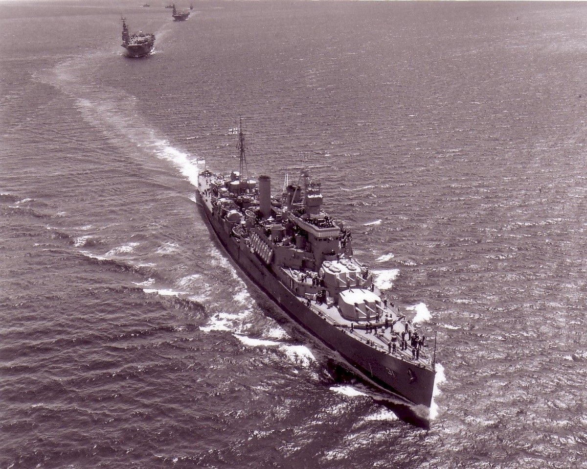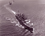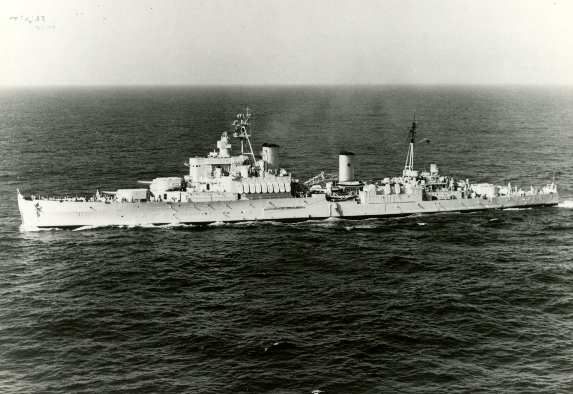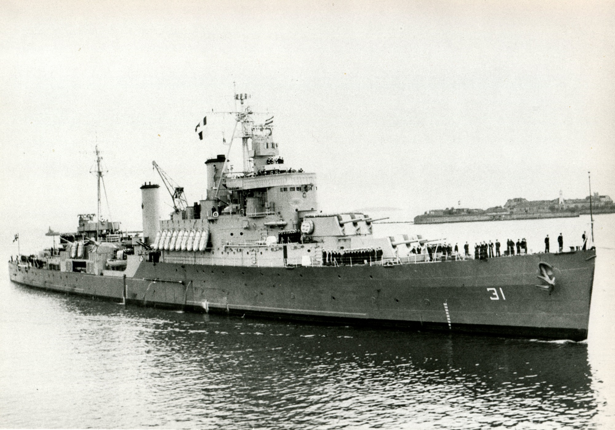 As HMS Uganda, the name-ship of her class, she was completed 03 Jan 1943, at Vickers-Armstrong Ltd., Newcastle-on-Tyne. After working up with the Home Fleet she joined Plymouth Command in Apr 1943 for operations in the Bay of Biscay and the English Channel, and in Jul 1943 joined the 15th Cruiser Squadron, Mediterranean Fleet, as part of Force "K." She was badly damaged by a German glider bomb on 13 Sep 1943, while supporting the Allied landing at Salerno, Italy, and arrived at Charleston, S.C., in November for a year of repair work. Presented to the RCN, the ship was commissioned HMCS UGANDA on 21 Oct 1944, at Charleston, and in Nov 1944 returned to the U.K. for further modifications. She left in Jan 1945, for the Pacific via the Suez Canal, to join the 4th Cruiser Squadron, British Pacific Fleet. In Apr 1945 she joined Task Force 57 in the Okinawa area, and was thereafter principally employed in screening the Fleet's aircraft carriers operating against Japanese airfields in the Ryukyu Islands. On 14 Jun 1945 she participated in the bombardment of Truk, and in Jul 1945 supported carriers operating against Tokyo. She left the Fleet late in Jul 1945 and arrived at Esquimalt on 10 Aug 1945 for refit. Uganda spent the rest of her career as a training ship; she was renamed QUEBEC on 14 Jan 1952.