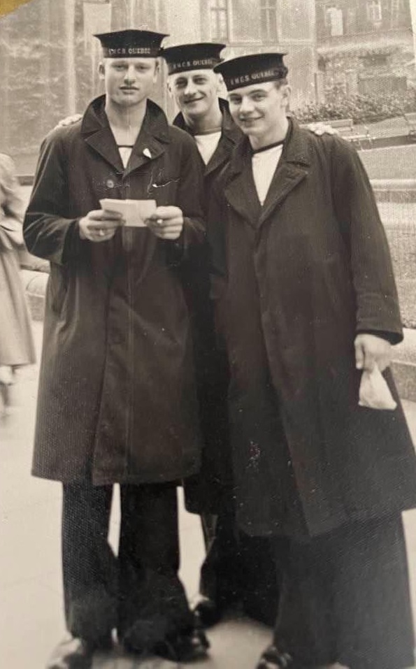 (JJJ16-JJJ18) HMCS QUEBEC sailors ashore in France (JJJ17) LS J.J. Joly 1st on right (JJJ18) Marville, France