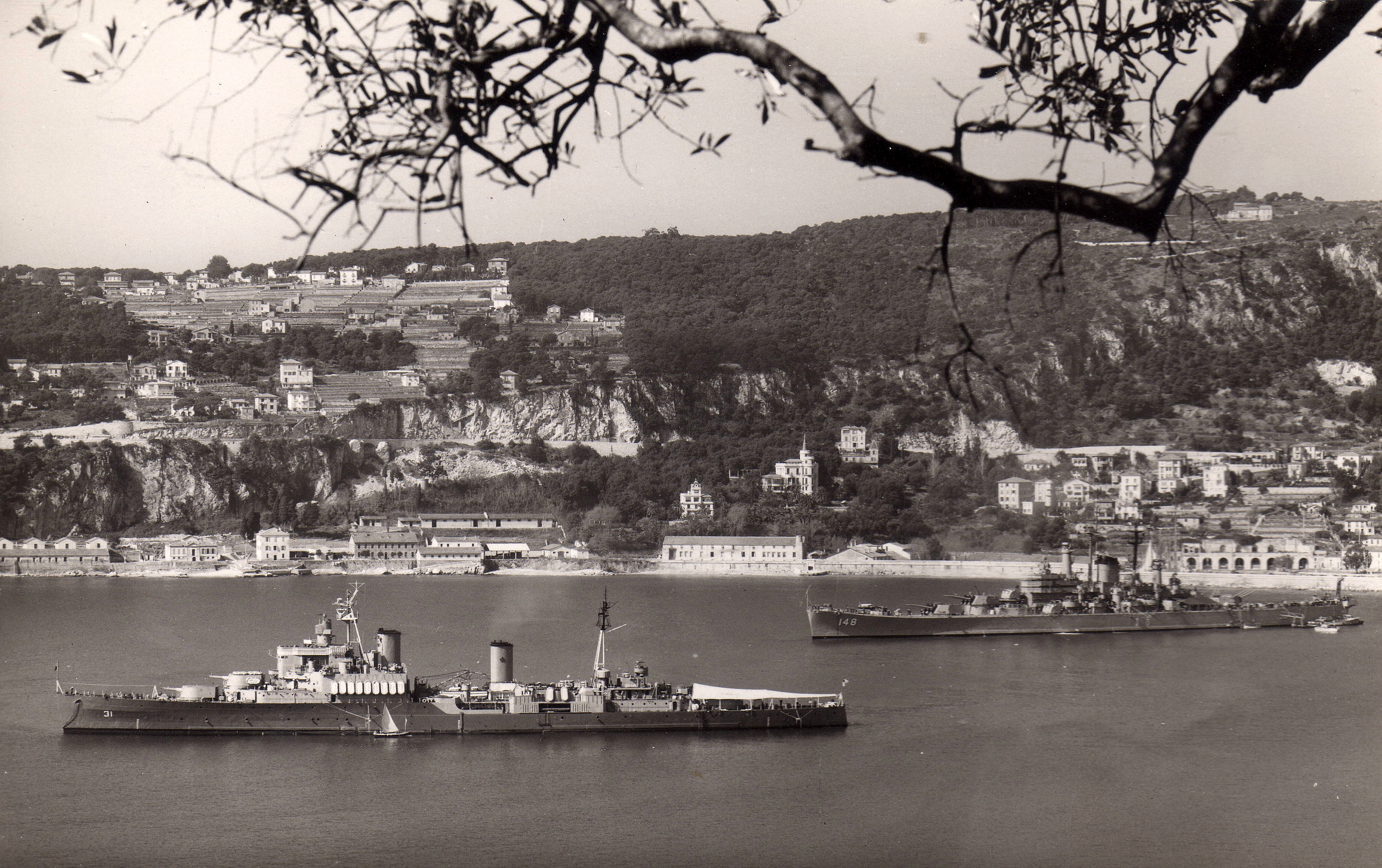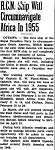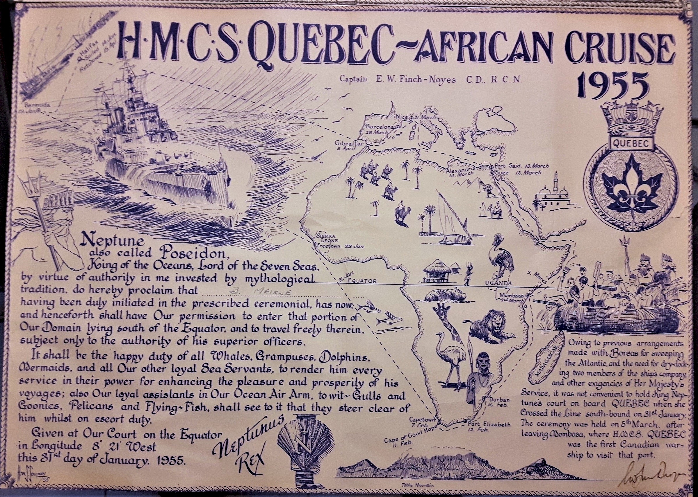 (QUE011) Newspaper Article from the Picton Gazette, 14 Jan 1955 on HMCS QUEBEC'S circumnavigation of Africa // Source: Prince Edward County Archives Microfilm collection // Researched and complied by: © John Lyons 2014 (QUE012) Crossing the Line certificate for B. Meikle during HMCS QUEBEC's African Cruise 1955 // Courtesy of Jason Rowbottom (QUE013) HMCS QUEBEC and USS NEWPORT NEWS at Villefranche between 22 and 27 Mar 1955 during HMCS QUEBEC'S good-will cruise of Africa Jan-Mar 1955 (QUE014) Sailors from HMCS QUEBEC ashore - location unknown // Source: obituary for John Karlich (QUE015) HMCS QUEBEC // From the collection of Larry Restall // Courtesy of Clayton Restall