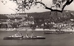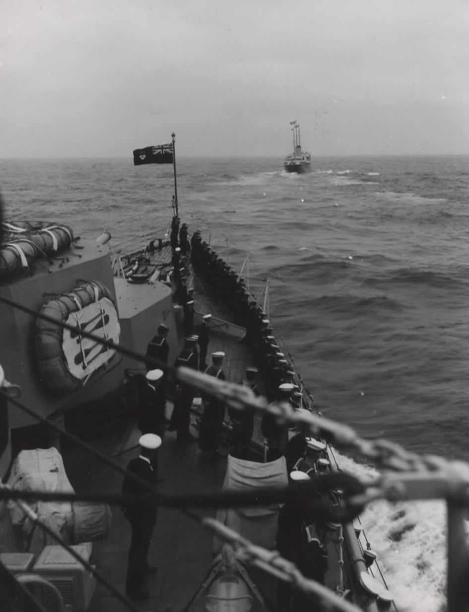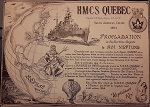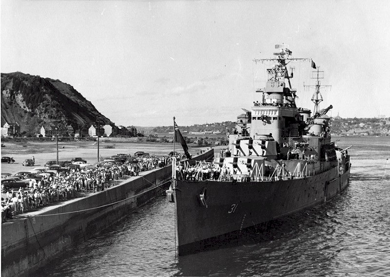After transiting from Esquimalt to Halifax in 1952, QUEBEC was soon sailed for Newfoundland where she took Lieutenant Governor Sir Leonard Outerbridge CBE - DSO, on an official tour of isolated Nfld out ports. This was a RCN service guaranteed under the terms of union with Canada. Upon returning to Halifax, the QUEBEC was selected as the flagship of Rear Admiral Bidwell, and tasked to lead Canada's Coronation Squadron to the Queen's Review of all Royal Naval and U S Naval Vessels at Spit head. HMCS QUEBEC was on hand for the opening of the Cape Breton Causeway on 13 Aug 1955 and fired a gun salute the mark the occasion. QUEBEC departed Halifax on 14 Jan 1955 for a good-will cruise around Africa, returning to Halifax on 15 Apr 1955. Later in 1955 she was tied up at the RCSCC Training Camp [Protector] at Point Edward Naval Station, Cape Breton N S. She was finally paid off on 13 Jun 1956. On 06 Feb 1961 she arrived at Osaka, Japan to be broken up.